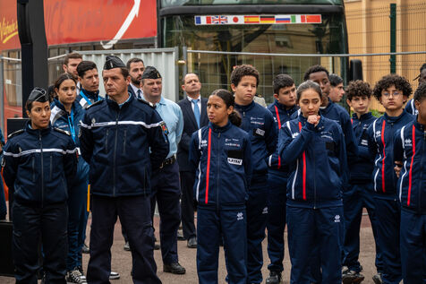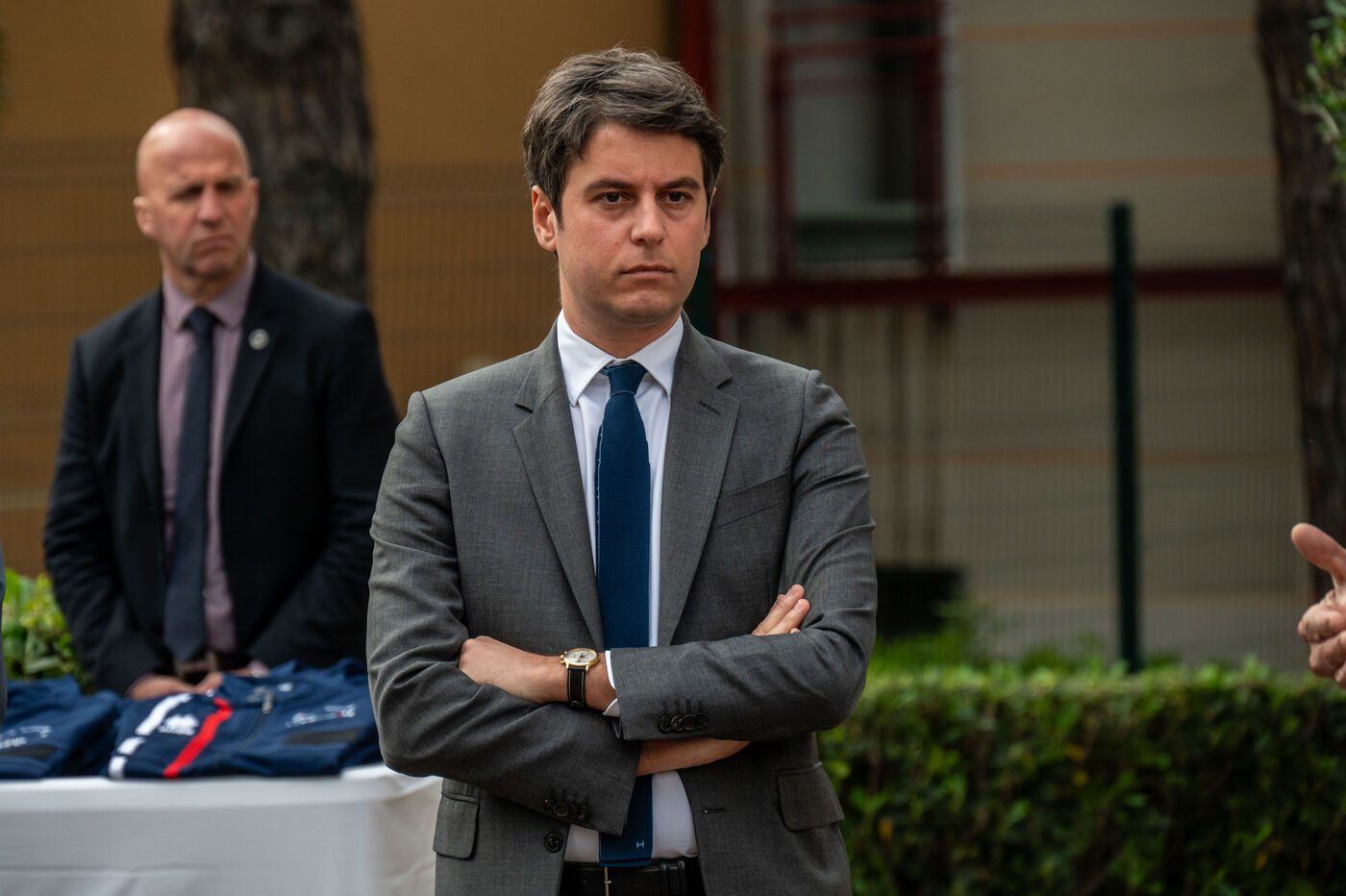 Gabriel Attal and Eric Dupont-Moretti on an official visit for the French government to a school in the centre of Nice on 22 April 2024. The Prime Minister and the Minister for Justice visit a secondary school in the centre of Nice, and answer questions from pupils, their families and the teaching staff.