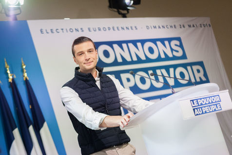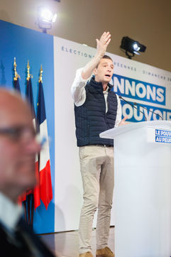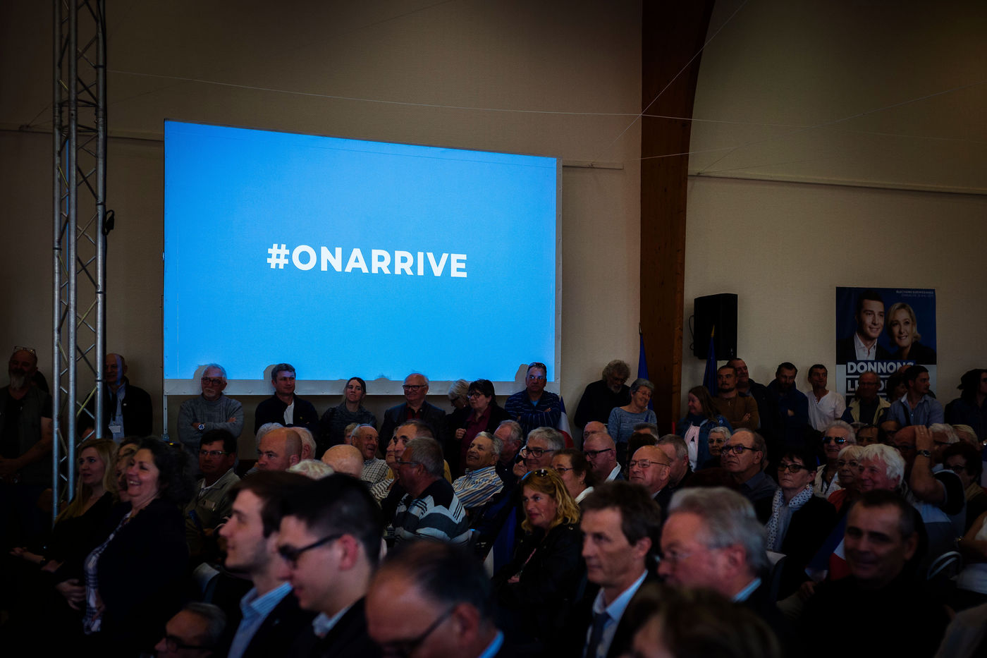 Meeting de Marine Le Pen accompagnée de la tête de liste du Rassemblement National pour les élections européennes Jordan Bardella à Chassors près de Jarnac en Charente, le 12 avril 2019 à Chassors, France.