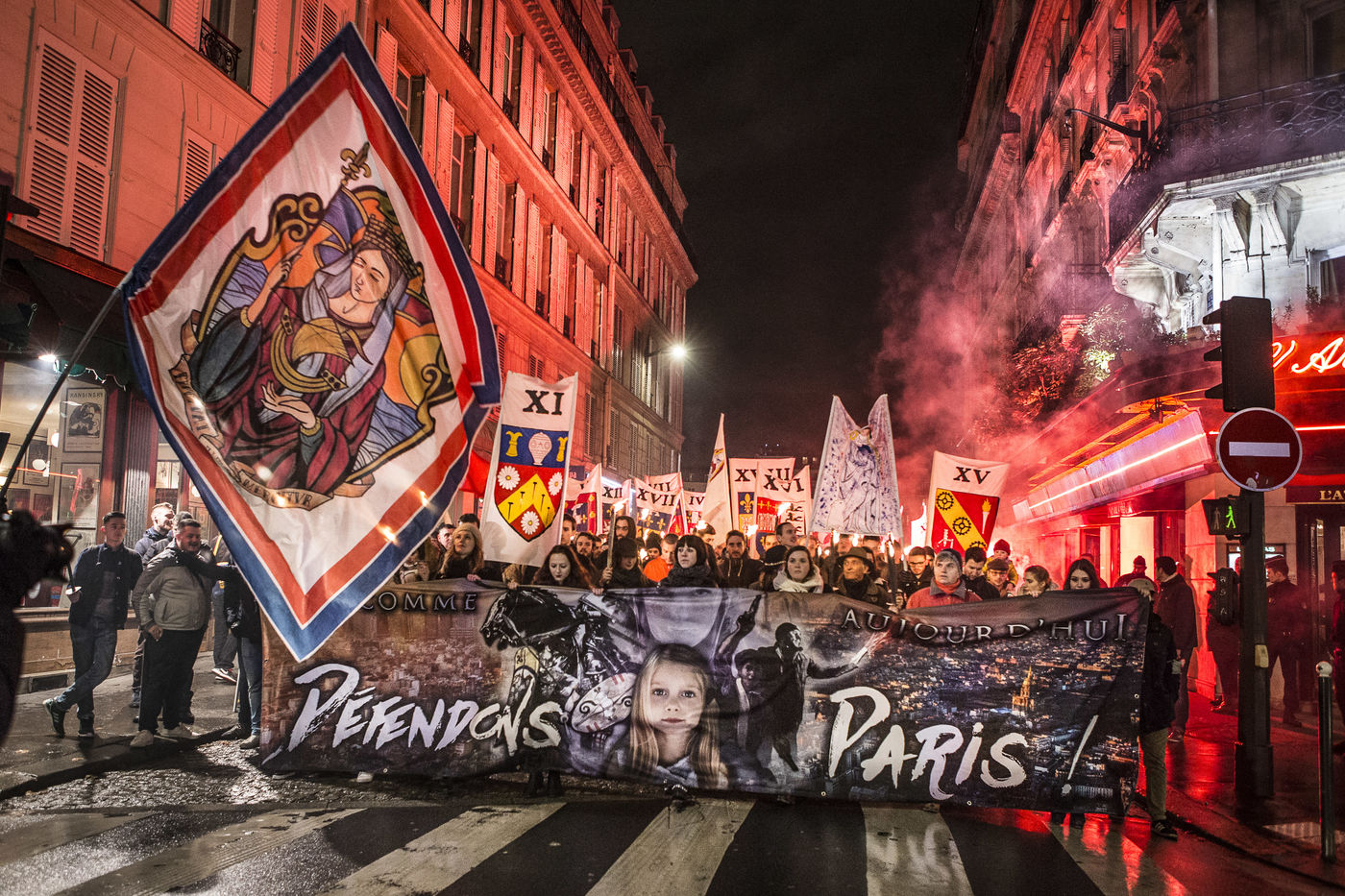 14 janvier 2017, Paris, FRANCE. Manifestation de "Paris fierté", une association qui émane de Génération Identitaire. La marche se déroule en l'honneur de Sainte-Geneviève patronne de la ville de Paris. Les slogans portent sur la défense de l'identité de Paris face à "l'immigration et l'islamisation"