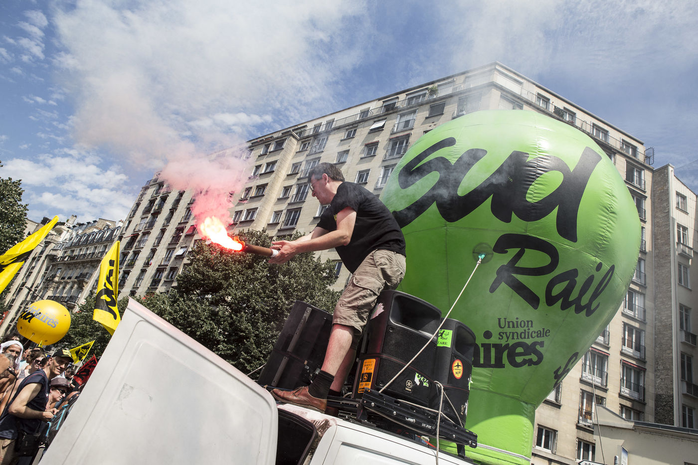 23 juin 2016, Paris (75), France. Manifestation contre la loi El-khomri, dite loi travail. Après avoir interdit cette manifestation du fait des violences et destructions lors des manifestations précédentes, le gouvernement a autorisé ce cortège en imposant un parcours et un contrôle des manifestants.