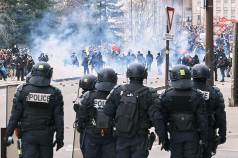 Police deployed in Nantes for the sixth day of strikes and demonstrations against pension reform on Tuesday 7 March 2023. 75,000 people (according to the work unions) marched through the streets of Nantes, 30,000 according to the prefecture.