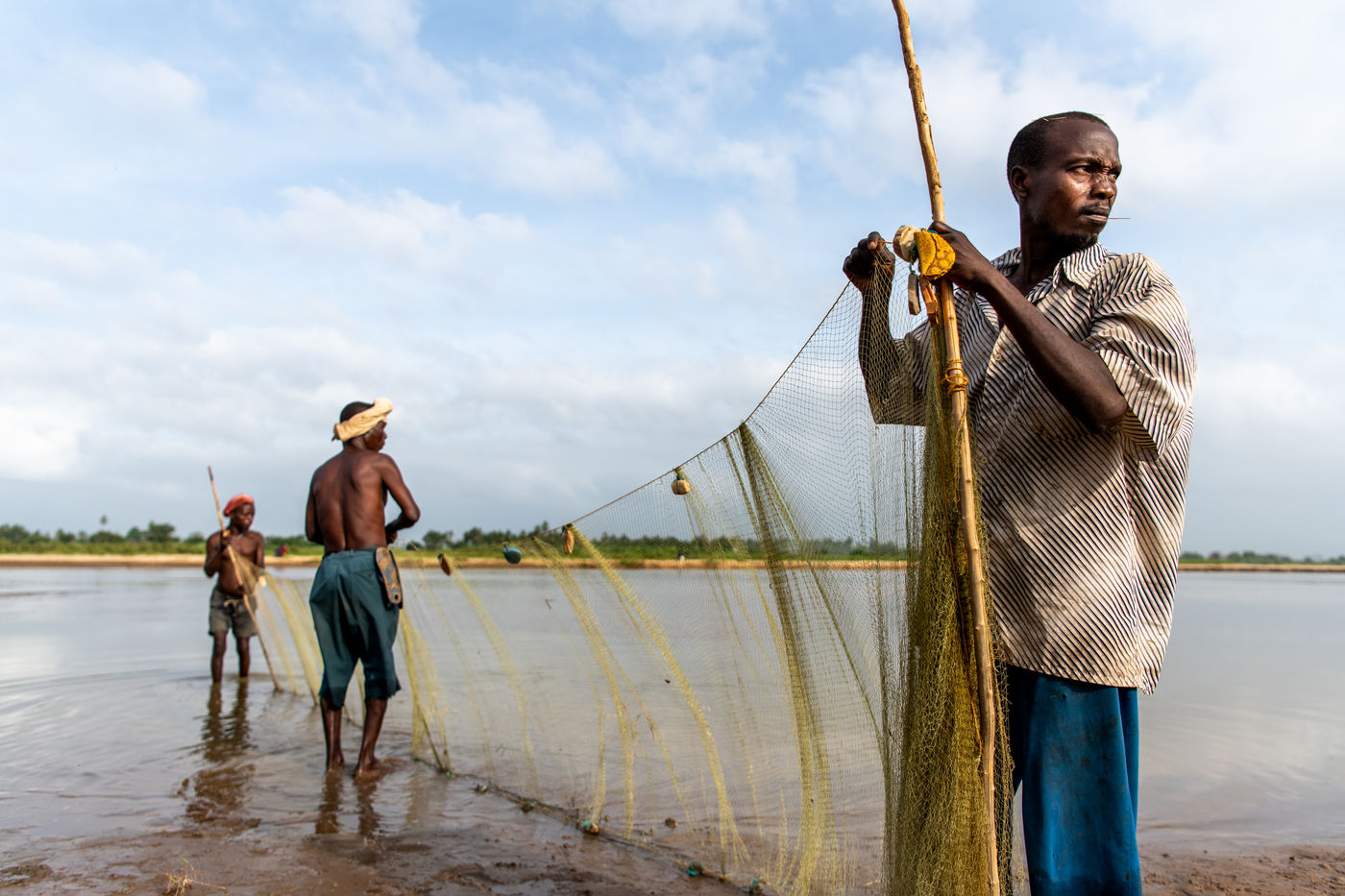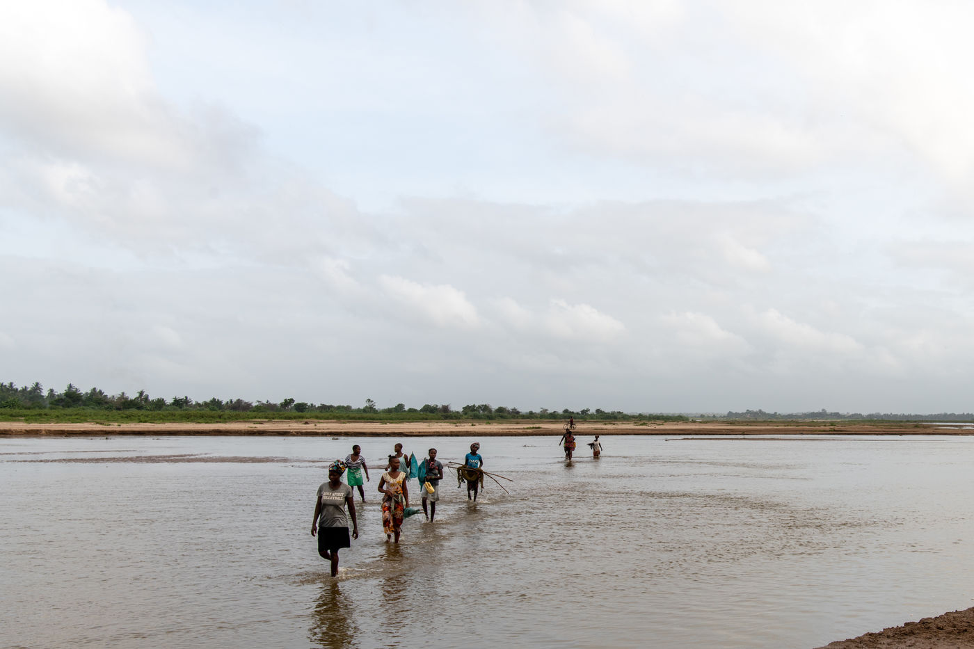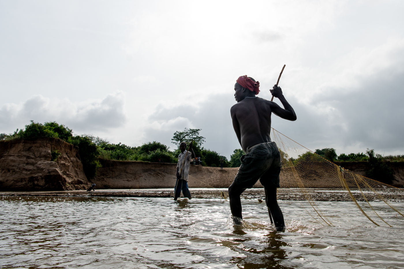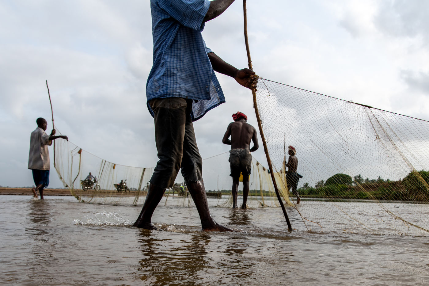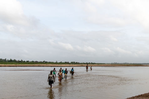 With water sometimes up to their necks, two to three people hold a net that they drag along the bank to catch passing fish.