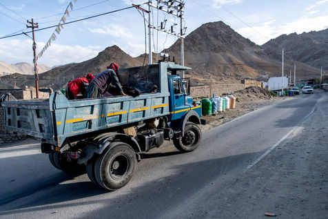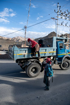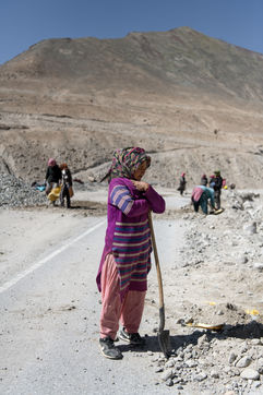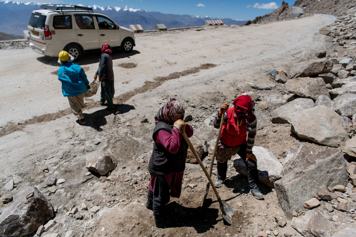 Chaque matin, un camion vient chercher les travailleurs et travailleuses de la Border Road Organisation et les dépose à des altitudes dépassant les 5500 mètres. Pelle à la main et sac en tissu pour toute brouette, hommes et femmes creusent la montagne, en dégagent la chaussée des roches tombées et rebouchent les ornières. À cette altitude où l'oxygène vient à manquer, on respire mal, chaque effort est pénible.