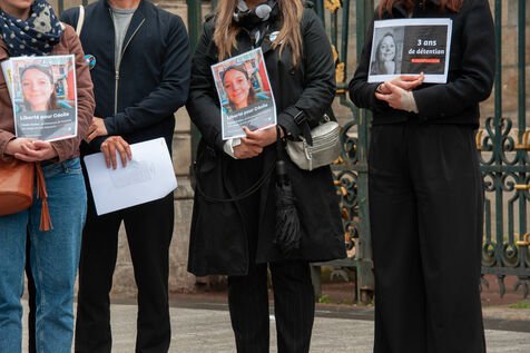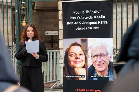 À Lyon, dans le Rhône, en France, le 7 mai 2025, des centaines de personnes se rassemblent pour soutenir les deux otages français, Cécile Kohler et Jacques Paris, détenus en Iran depuis 3 ans.
