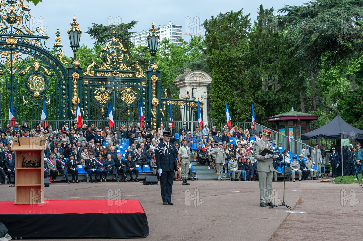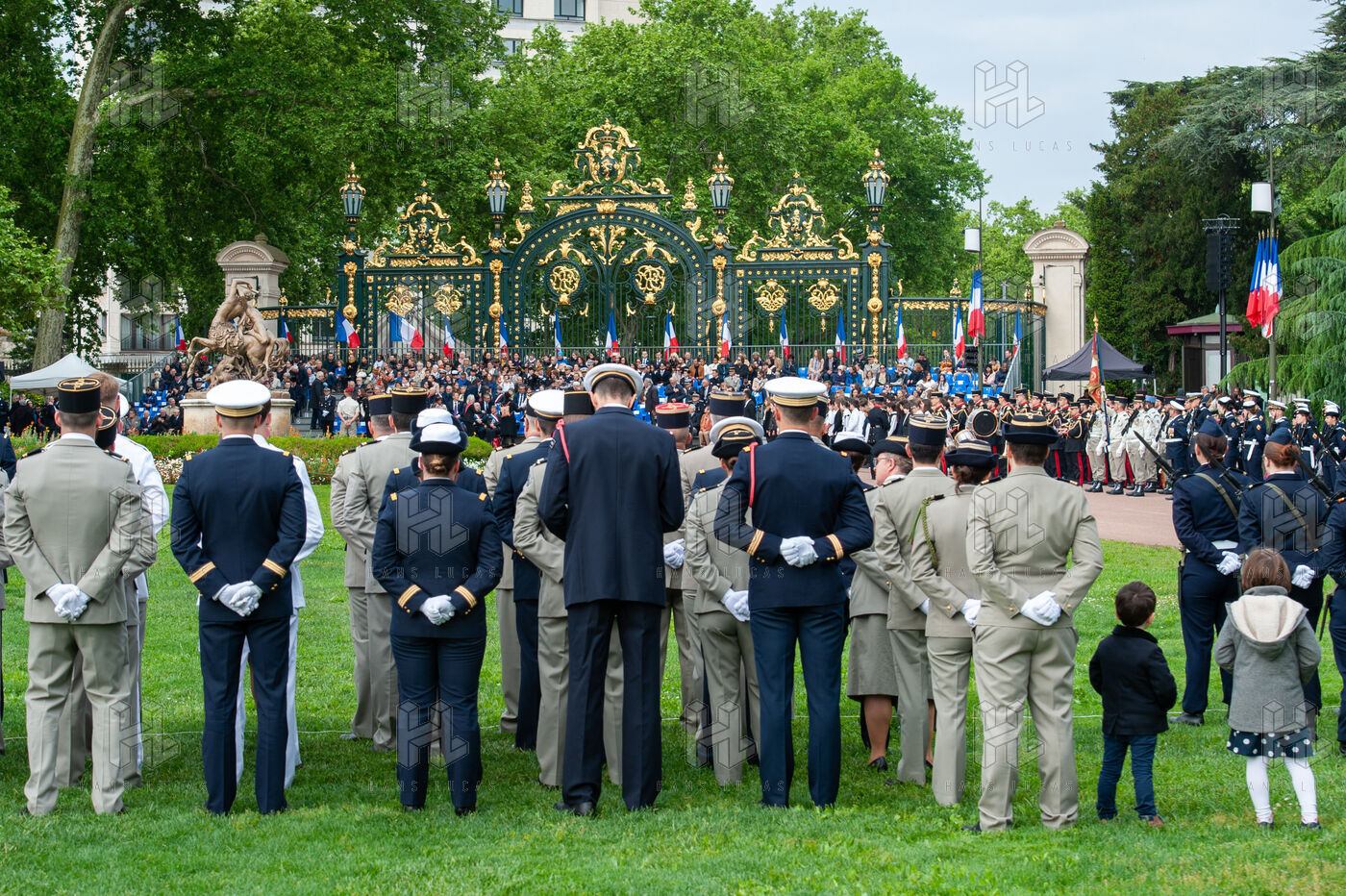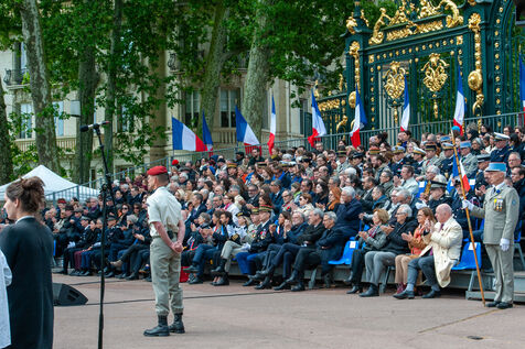 À Lyon, dans le Rhône, en France, le 8 mai 2025, des centaines de personnes se rassemblent en commémoration du 8 mai 1945. Reportage vécue à travers le point de vue du chef de corps Fabien Striffling donnants les ordres aux formations présentes. Racontant le déroulé de la cérémonie.