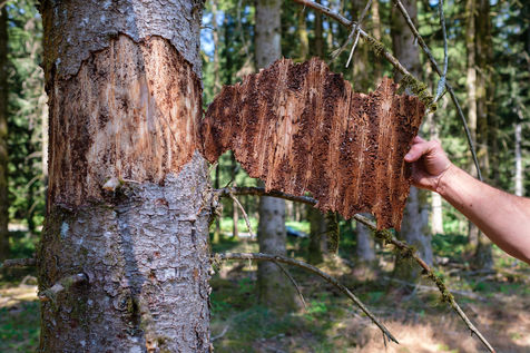 Mathias Bonneau is a logger and forest manager in the Black Mountain. In his spruce forests, he has observed bark beetle attacks that are spreading and reaching individuals that were still in good health until recently. Faced with this parasite, he carries out early felling of individuals detected as sick, which he then barks to kill the bark beetle larvae. This is an experimental technique that he uses to try to limit the spread of the epidemic.