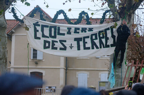 France, Saint-Germain-des-Pres, 2023-12-09. Manifestation action (Manif'Action) against the A69 freeway, concrete and bitumen organized by La Voie est Libre (LVEL), Exctinction Rebellion Toulouse (XR), Groupe National de Surveillance des Arbres (GNSA), Castres Antifasciste, Lauraguais sans bitume and Les Soulevements de la Terre.
