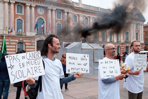 France, Toulouse, 2024-05-04. Action du collectif d'écologie radicale Extinction Rebellion (XR) sur la place du capitole à Toulouse pour protester contre l'autoroute A69 et la pollution engendrée par les centrales à enrobé.