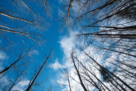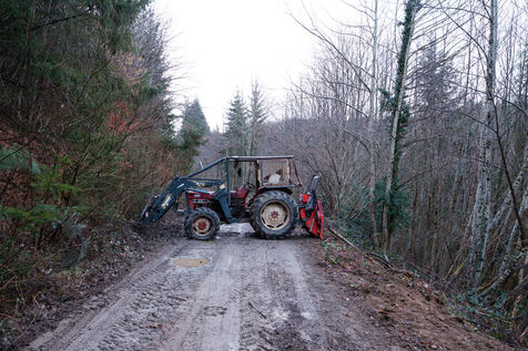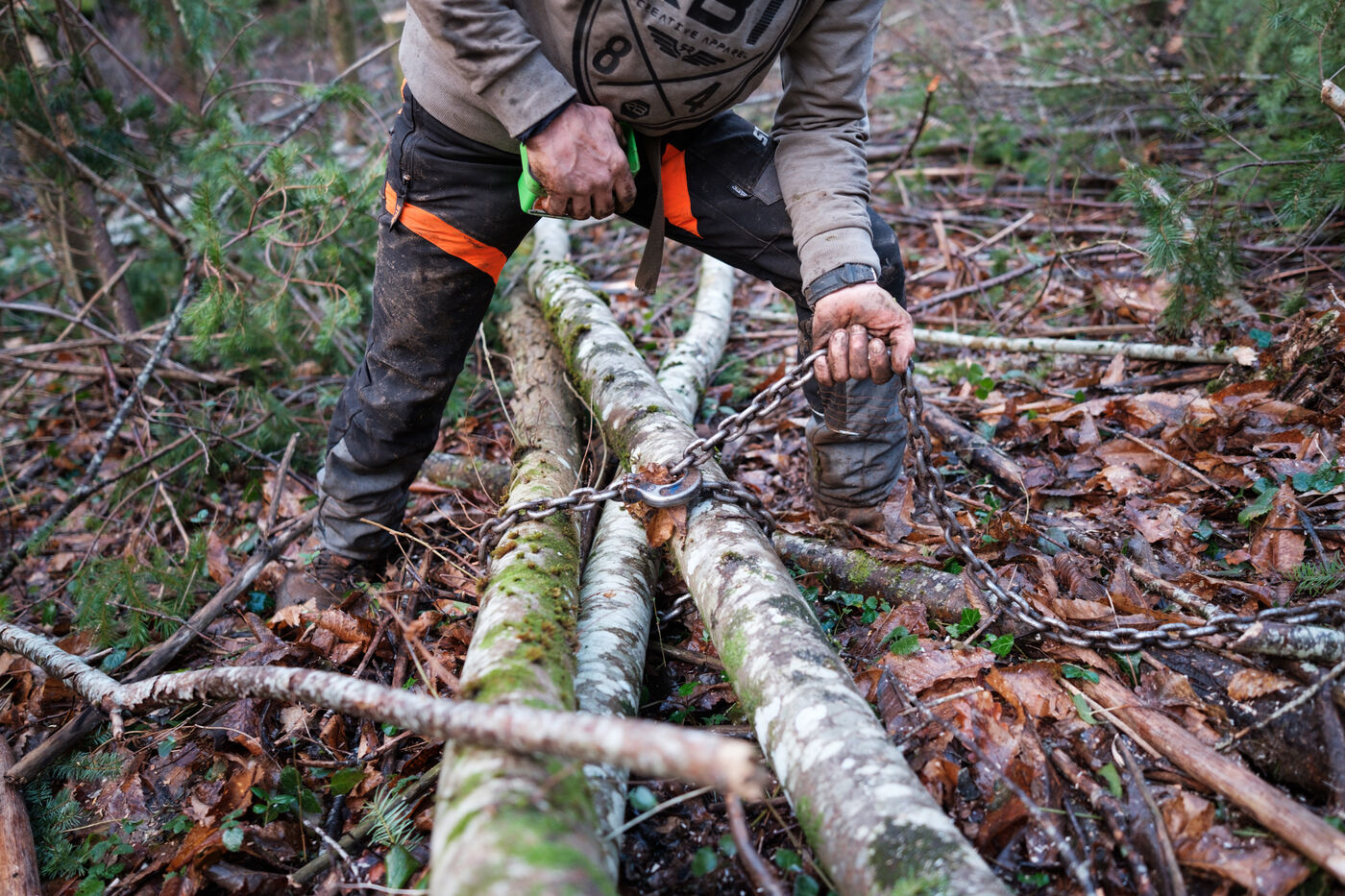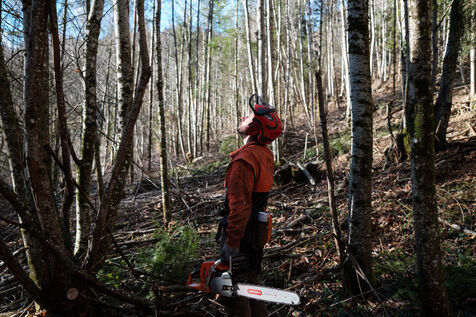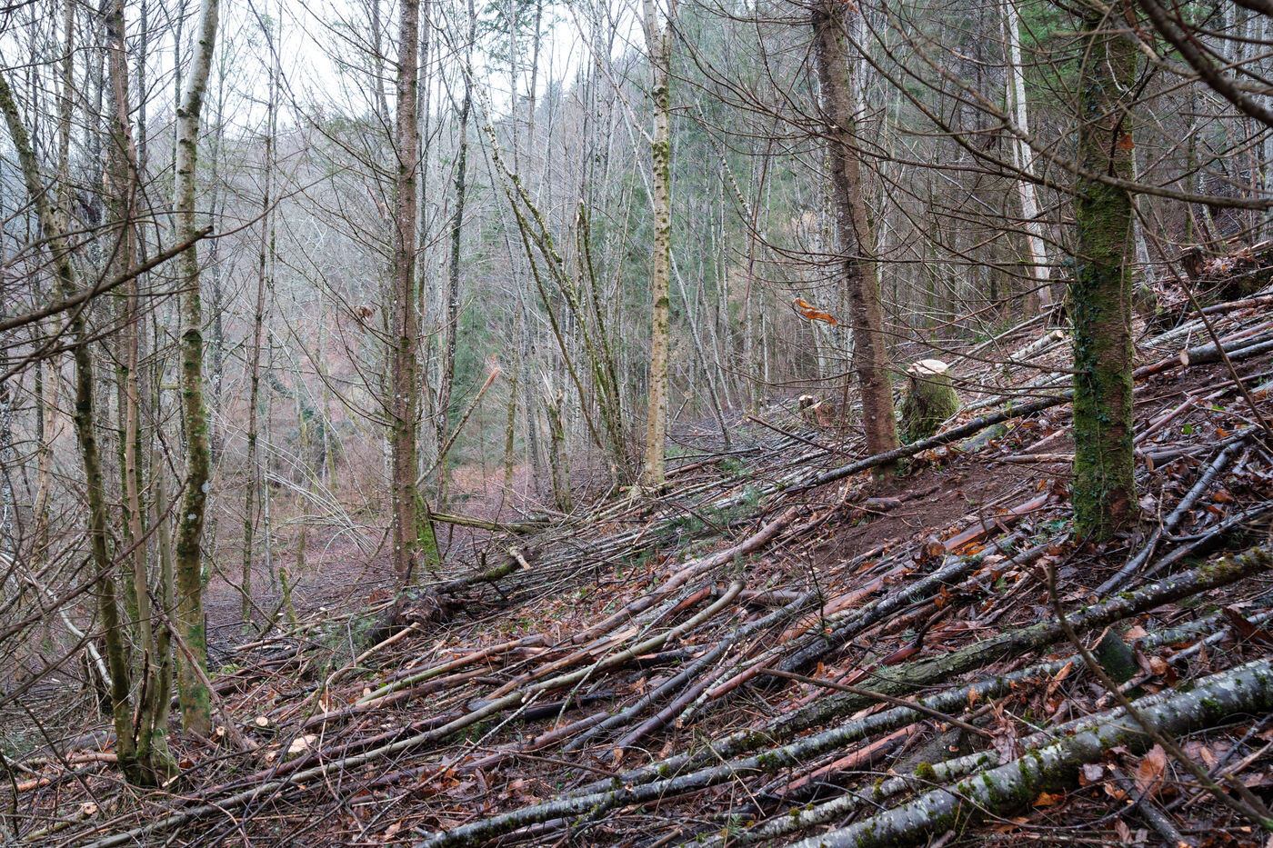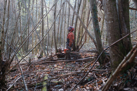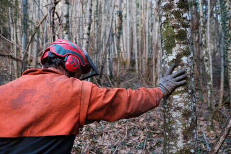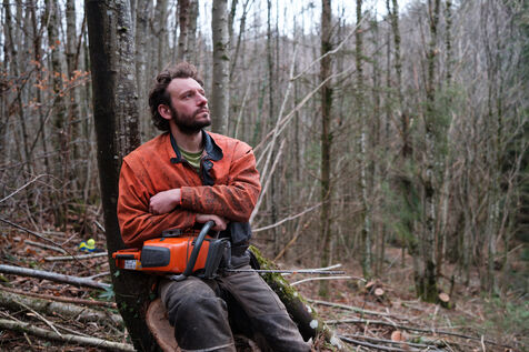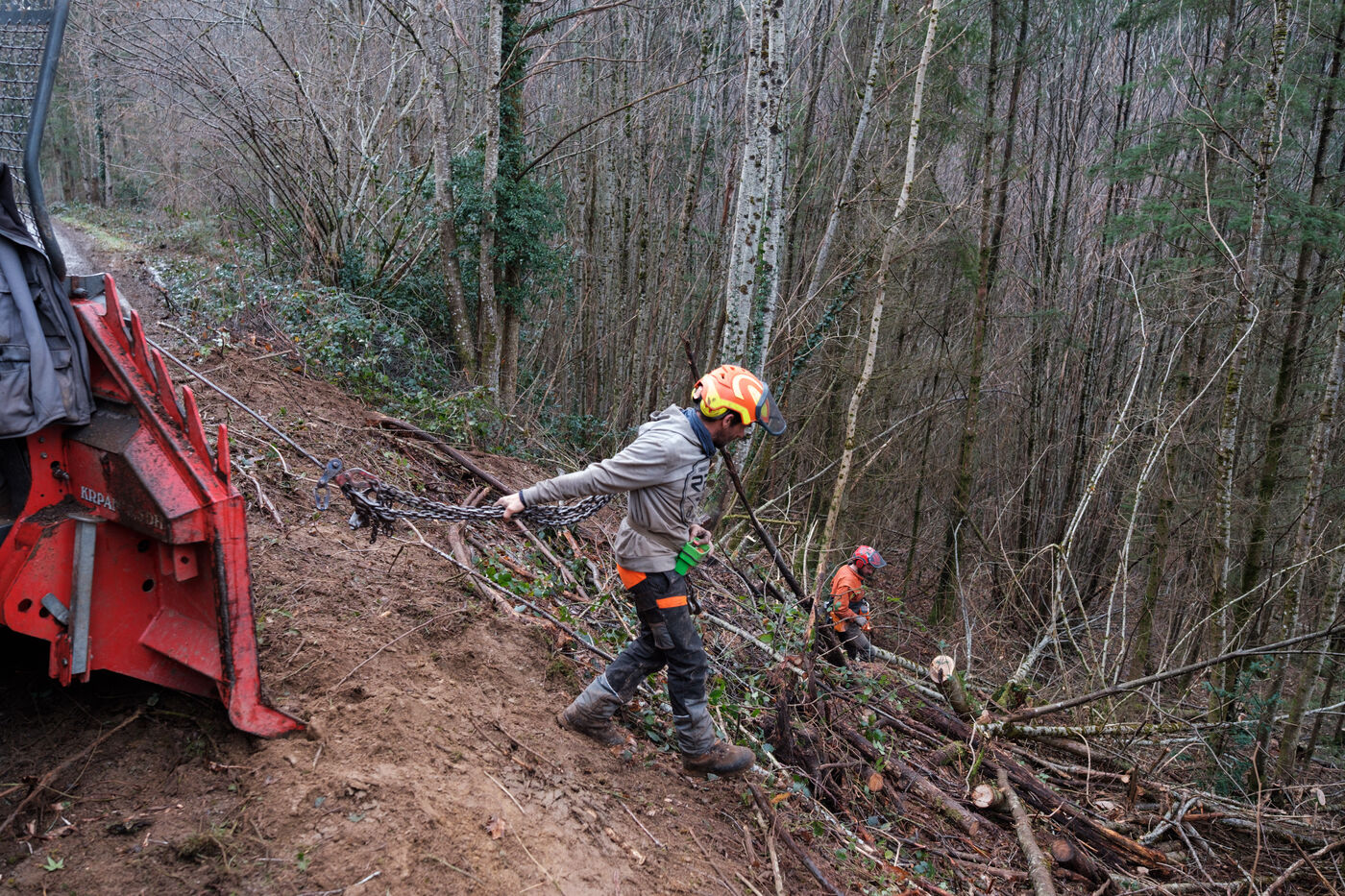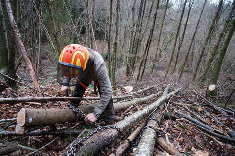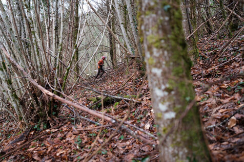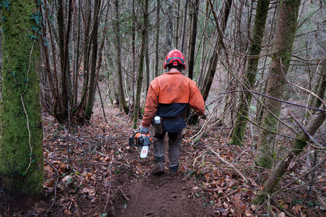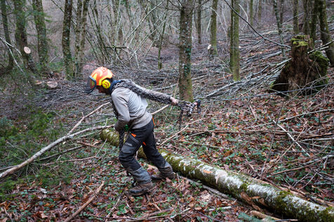 Balivage worksite on a dense coppiced chestnut stand that has not been touched since a previous clear-cut. Mathias Bonneau, a woodcutter and forest manager, is carrying out balivage to aerate the stand and lead it towards a diversified stand under irregular management with a continuous canopy, as part of a management process that is more respectful of the forest ecosystem and an alternative to industrial management.