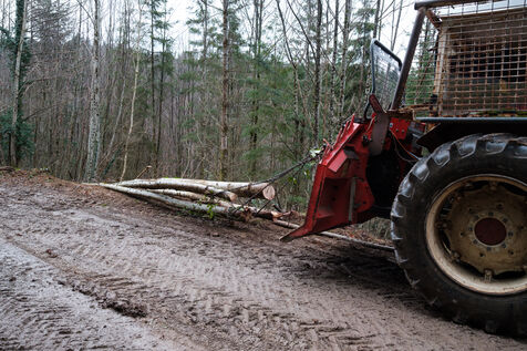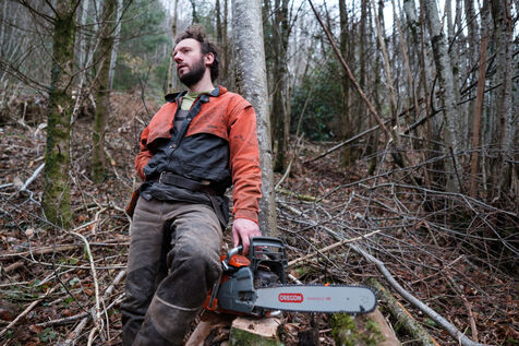 Chantier de Balivage sur un peuplement dense de châtaignier en taillis qui n'a pas été touché depuis une coupe rase précédente. Mathias Bonneau est bucheron et gestionnaire forestier et procède à un balivage pour aérer le peuplement et le conduire vers un peuplement diversifié en gestion irrégulière et à couvert continu qui s'inscrit dans un processus de gestion plus respectueuse de l'écosystème forestier et alternatif à la gestion industrielle.
