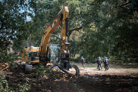 France, Saïx, 2024-08-30. Destruction du lieu d'occupation de la Cal'Arbre de la ZAD contre l'A69 où des militants et zadistes sont perchés dans des arbres pour les protéger contre l'abattage.
