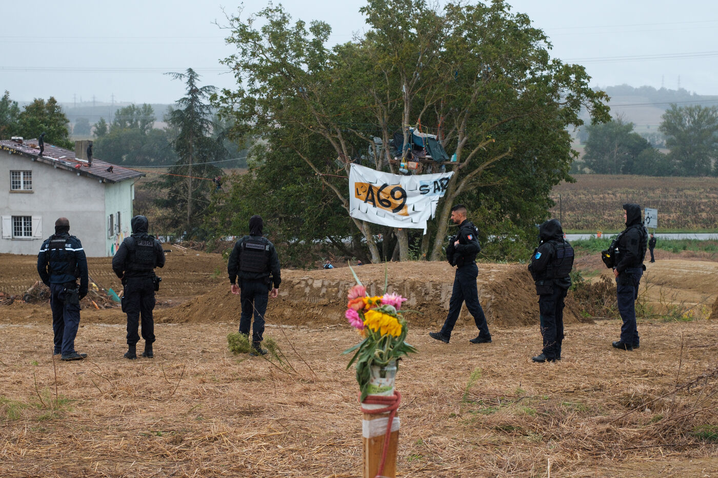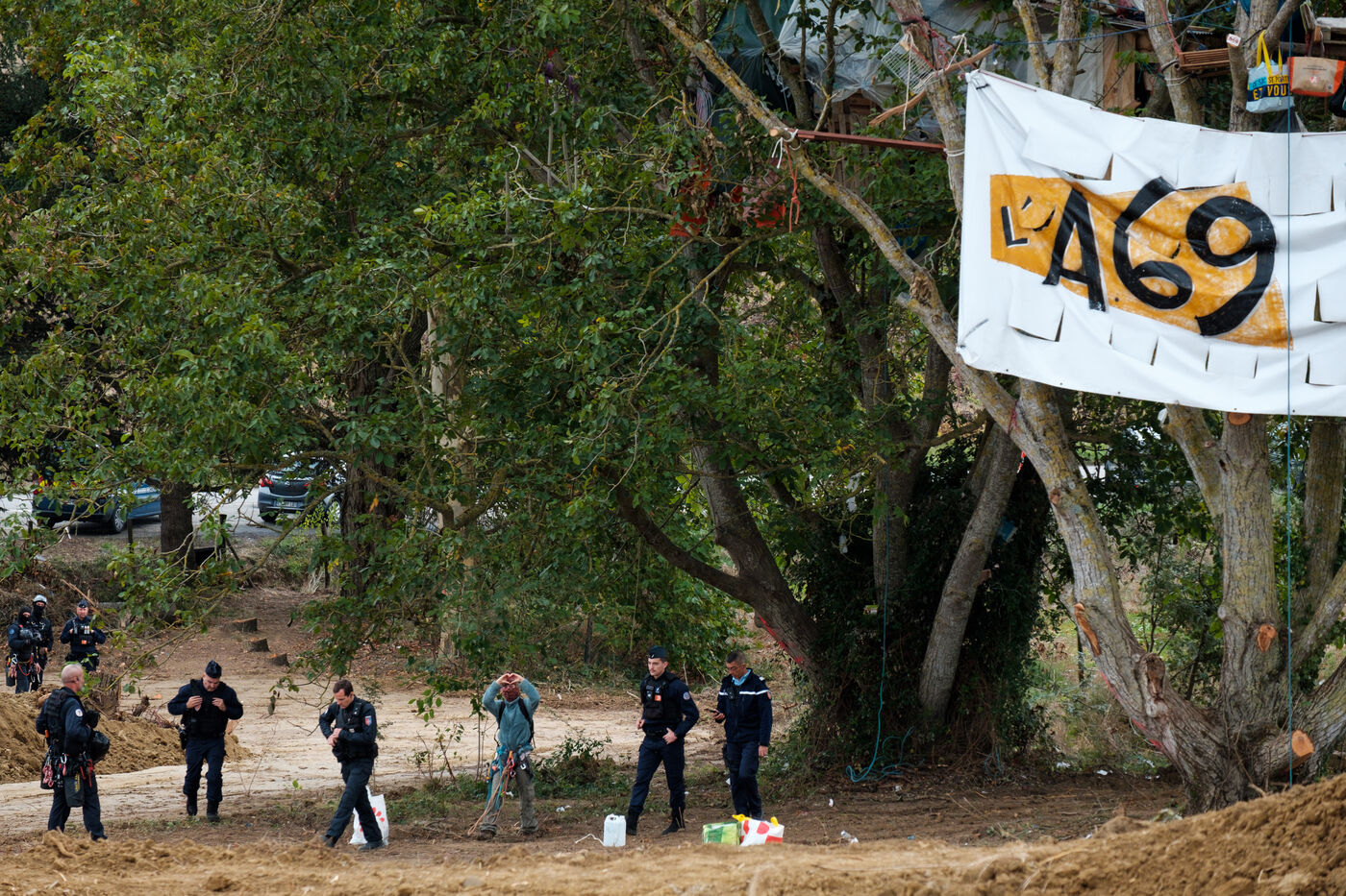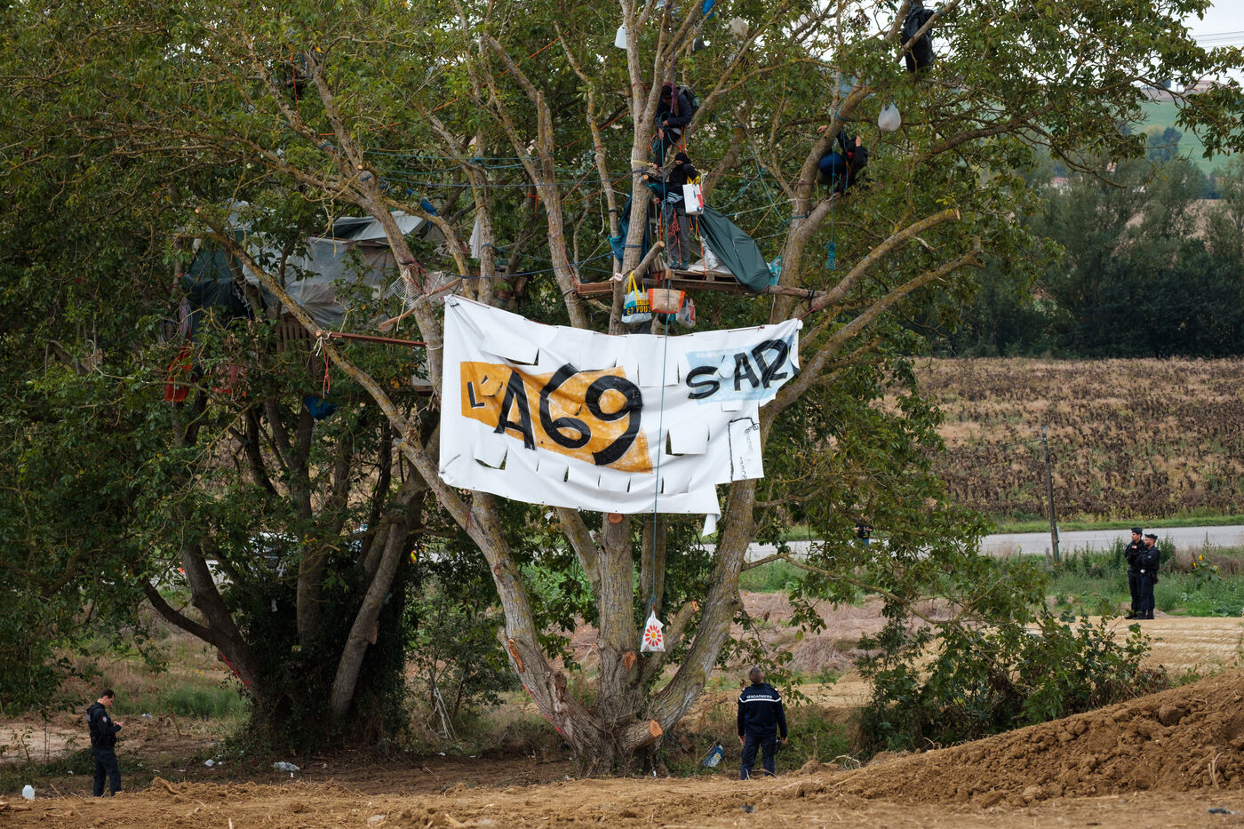France, Verfeil, 2024-09-27. After two weeks of attempts to evacuate the ZAD against the A69 at the Verger site by the forces of law and order, squirrels (activists) are still in the trees to protect them from felling and to oppose the construction of the A69 freeway.
