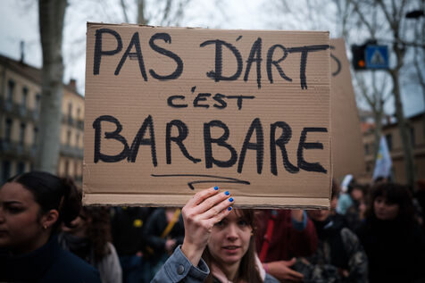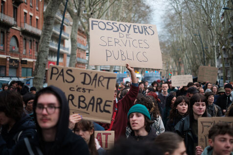 France, Toulouse, 2025-03-13. Manifestation des étudiants contre l'austérité économique dans le service public, à l'université, la précarité dans la culture, l'art et la situation politique notamment la montée de l'extrême droite.