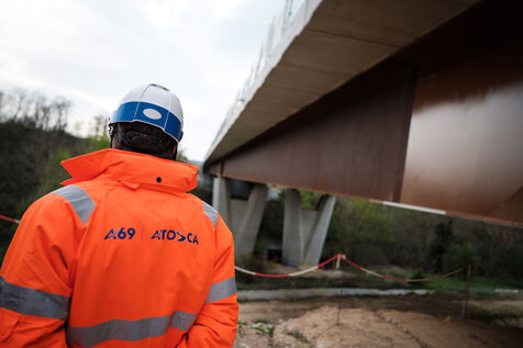 France, Castres, 2025-04-04. The Minister of Transport Philippe Tabarot visits the A69 freeway worksite at the Agout viaduct site, accompanied by elected officials and political representatives.