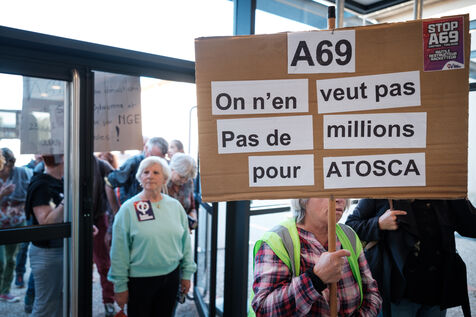Protest by opponents of the A69 motorway during the Castres-Mazamet urban community council meeting, where a vote is being held to award a new public subsidy from the urban community to the concessionaire Atosca in exchange for a reduction in toll prices, in Castres in the Tarn department in southern France, on September 30, 2025. The total public subsidy amounts to €41 million, of which the metropolitan community is contributing €2.750 million.