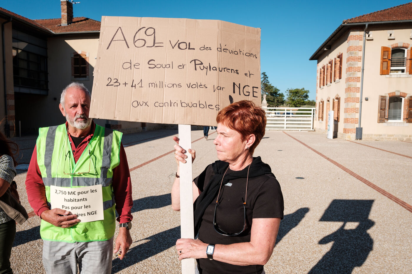 Manifestation des opposants à l'autoroute A69 lors du conseil d'agglomération Castres-Mazamet où se tient le vote pour attribuer une nouvelle subvention publique de l'agglomération au concessionnaire Atosca en contre partie d'une baisse du prix du péage, à Castres dans le département du Tarn dans le sud de la France, le 30 septembre 2025. Une subvention publique totale de 41 millions d'euros dont la communauté d'agglomération participe a hauteur de 2,750 millions d'euros.