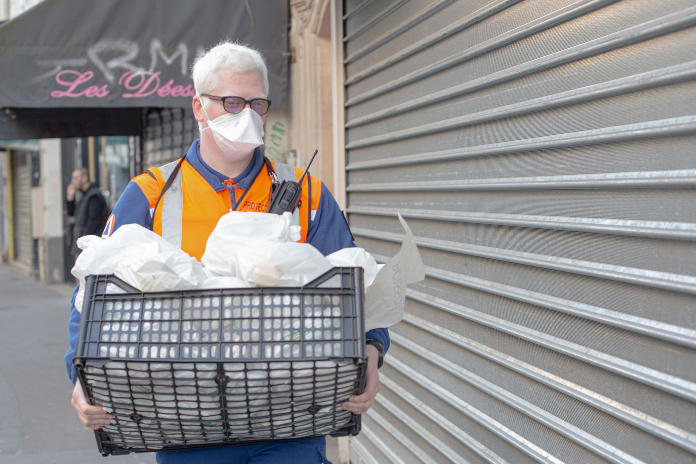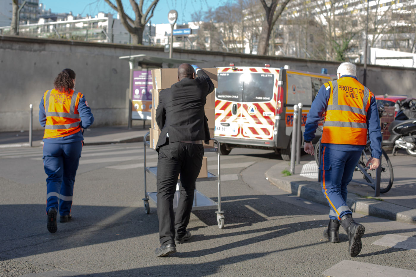 Maraude de la protection civile de paris dans le 19eme arrondisemment durant la pandémie de Covid-19, le 25 mars 2020, Paris.