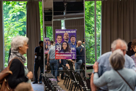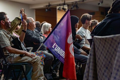 Whether in a meeting hall or pasted across city walls, the visuals of La France insoumise carry the colors and messages of a movement grounded in resistance.