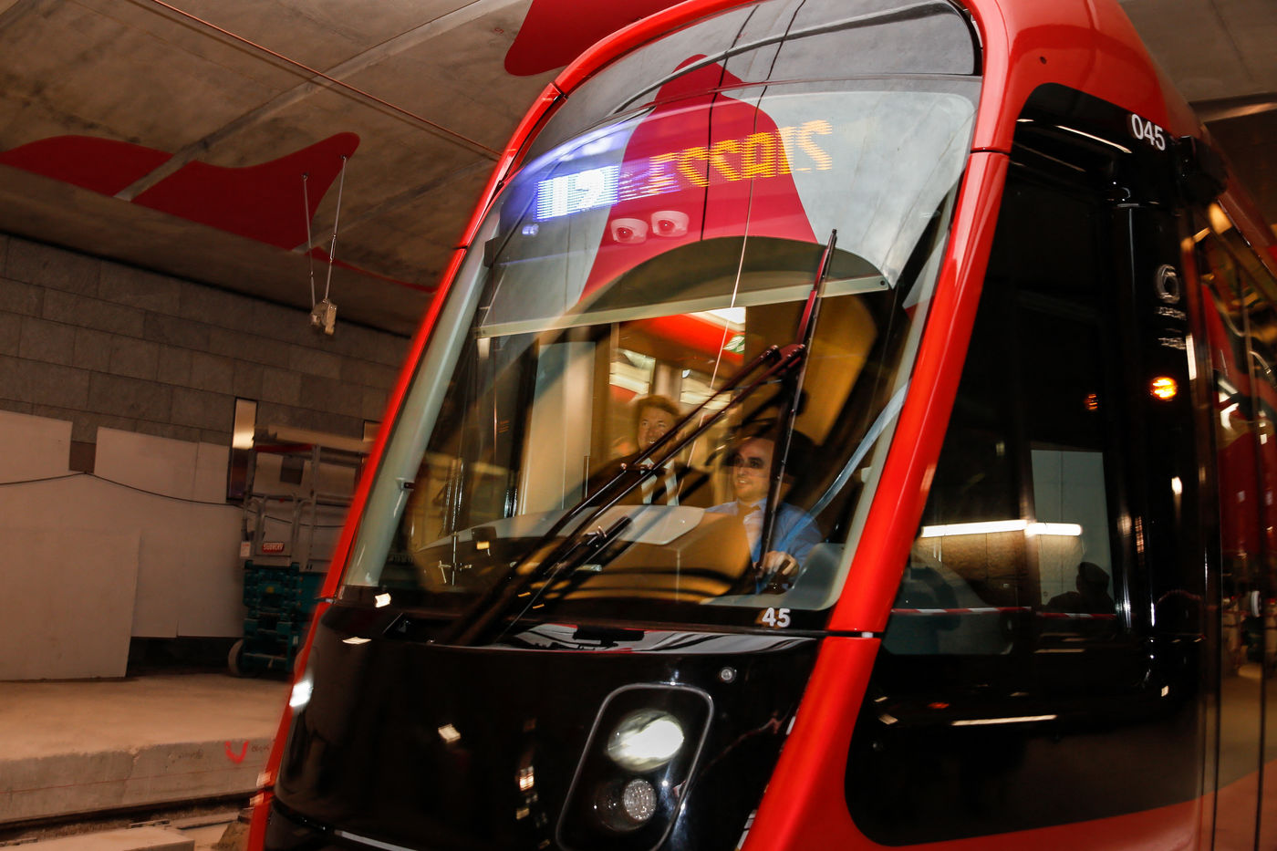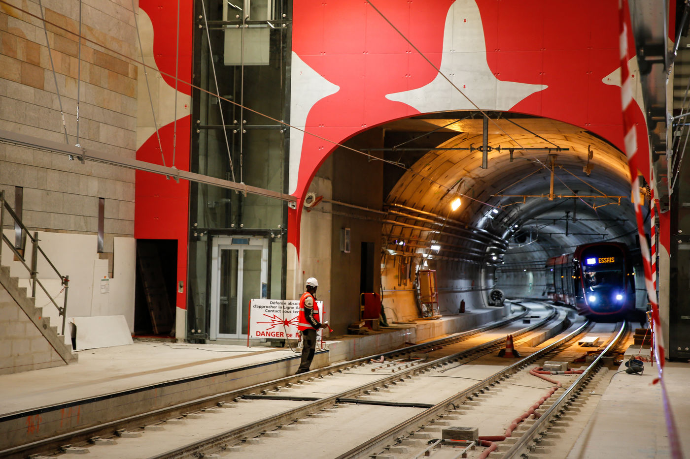 This is a first in all the steps taken on the construction site of the tramway's West-East line. The first tramway train enters the tunnel.