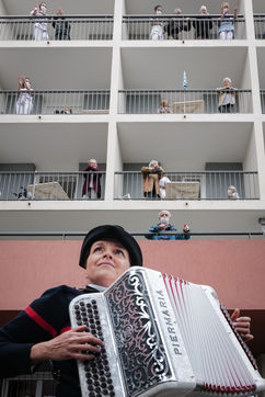 Dans un EHPAD de Nice, un concert solidaire de soutien aux personnes âgées est organisé par l'orchestre des pompiers à l'accordéon et trompette. Les pensionnaires confinés écoutent la musique à leur balcon ou à leur fenêtre. Une initiative qui propose une parenthèse musicale et apporte un peu de joie aux personnes agées qui ont été privées de visites depuis plusieurs semaines.