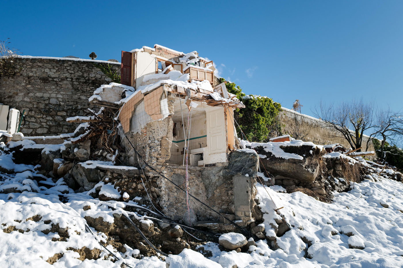 2 mois après la tempête ALEX, la Vallée de la Vésubie sinistrée peine a se reconstruire sous la neige. Les ruines de maisons et les carcasses de voitures sont devenues le nouveau decor pour les habitants.