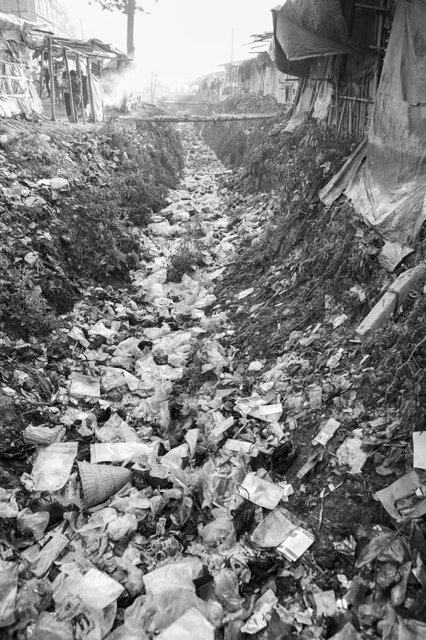 Nepal - Reportage sur une famille de tailleur de pierre vivant sous une tente entre le périphérique et un caniveau