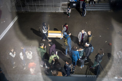 To celebrate the 70th anniversary of Abbé Pierre's appeal, the Jamais Sans Toit network and the Emmaus community of Bourgoin Jallieu hosted a meal at the Montel school. The Jamais sans toit Lyon collective requisitioned the unoccupied Montel school to shelter 112 people, including 64 homeless children, until an emergency accommodation solution could be found for them. Unconditional shelter for the homeless.