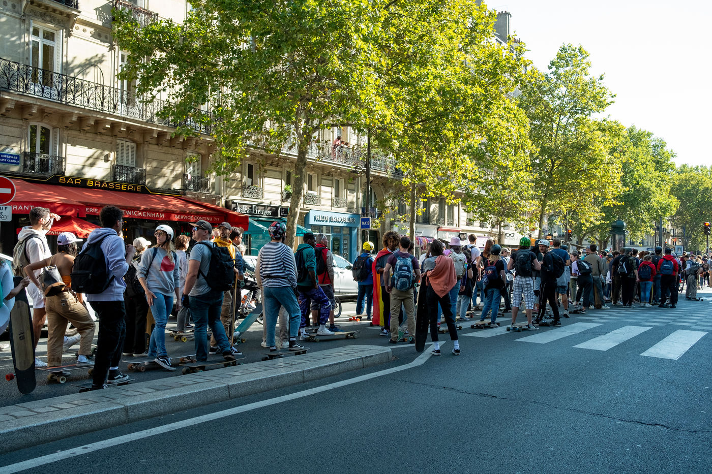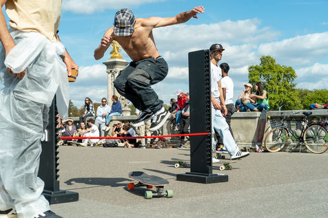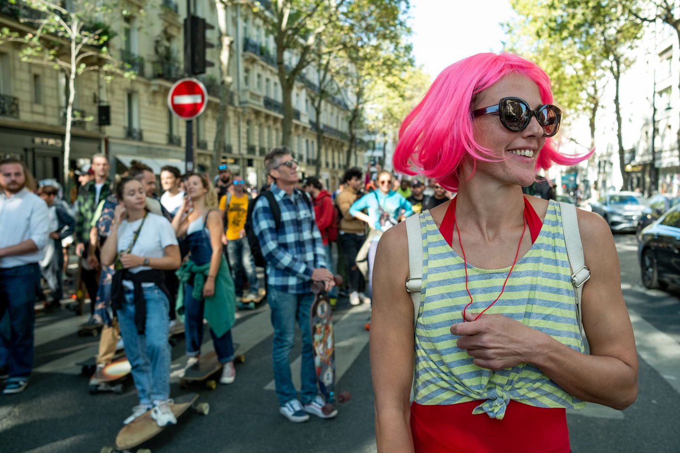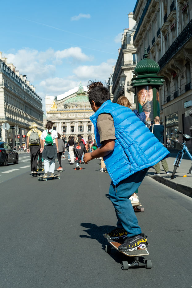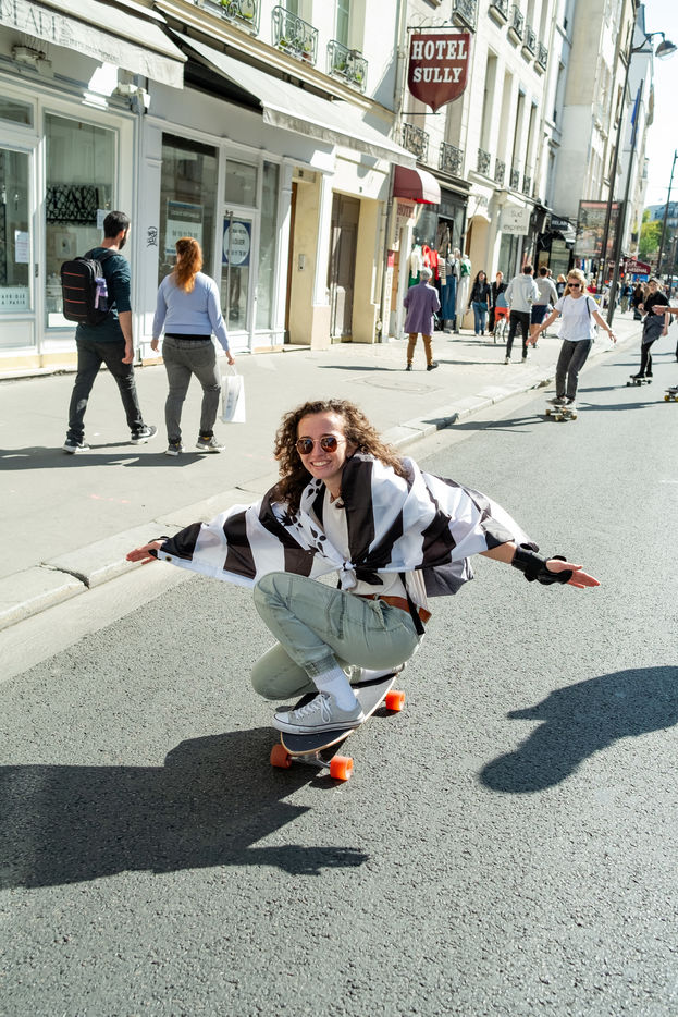 Longboard tour in the city of Paris organized by the association DockSession at the initiative of the professional skater and influencer Lotfi Lamaali. A thousand of participants gather disguised and equiped with their board to cruise through the capital during a special car free day.