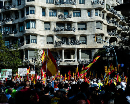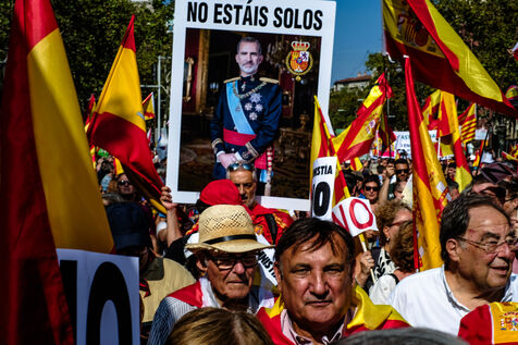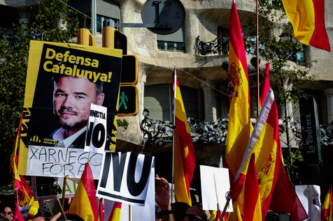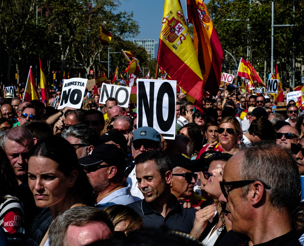 Spain, Barcelona, 2023/10/08. Demonstration in Barcelona organised by the "Catalan Civil Society" (Sociedad Civil Catalana, SCC) against the amnesty for the pro-independence leader Carles Puigdemont. The protesters gathered under the slogan "Not in my name, no amnesty, no self-determination."