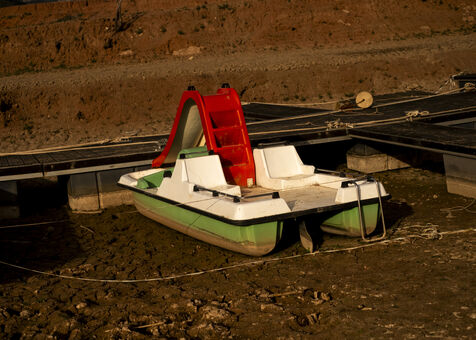 Espagne, Barcelone, 2024/03/21. Sécheresse record en Catalogne. Le barrage de Sau est presque vide, des restes d'un vieux village apparaissent. Photographie par Alexandre Bre / Hans Lucas.