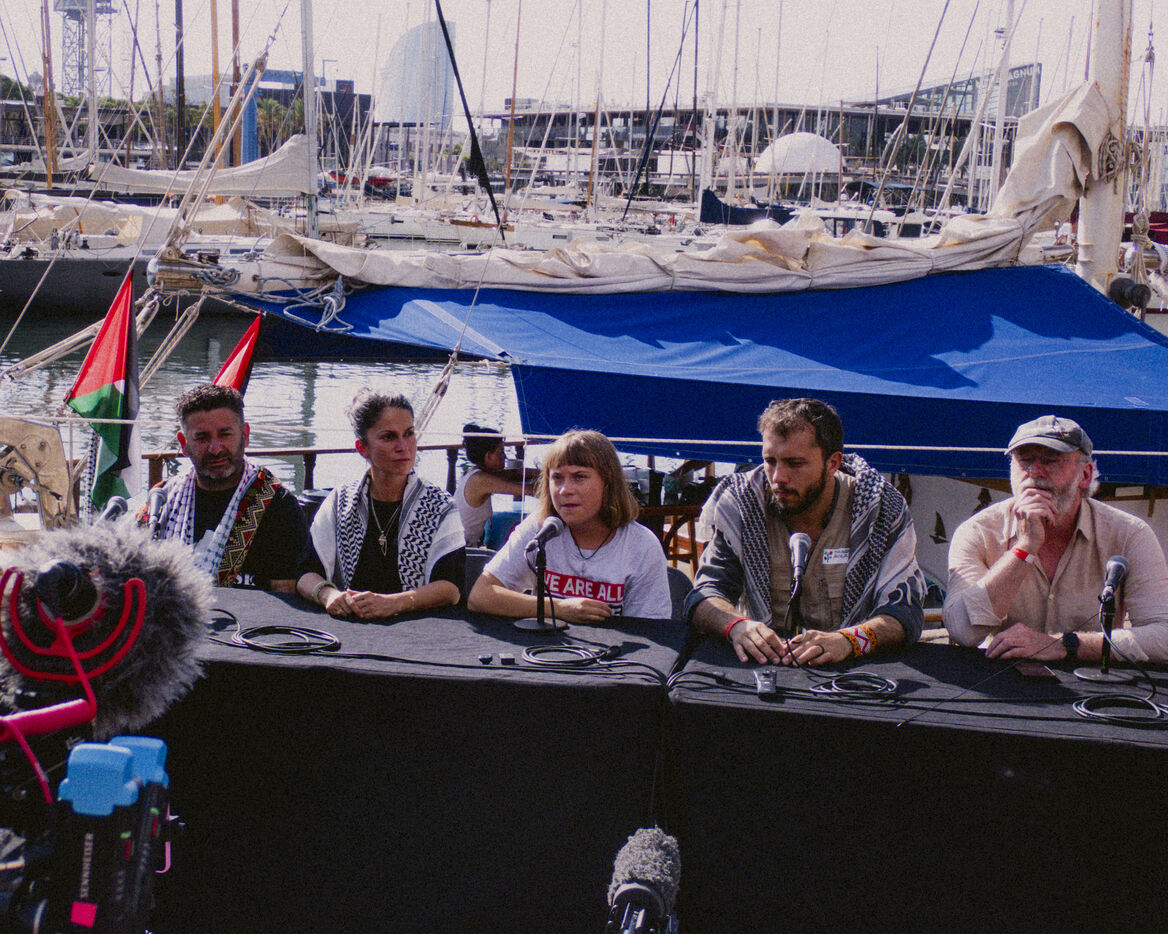 Spain, Barcelona, 2025/08/31. Activists from 44 countries, including Greta Thunberg, embark from Barcelona as part of the Freedom Flotilla 2025, the largest humanitarian mission to Gaza to date. The initiative aims to break the Israeli blockade and establish a humanitarian corridor. Photograph by Alexandre Bré / Hans Lucas.