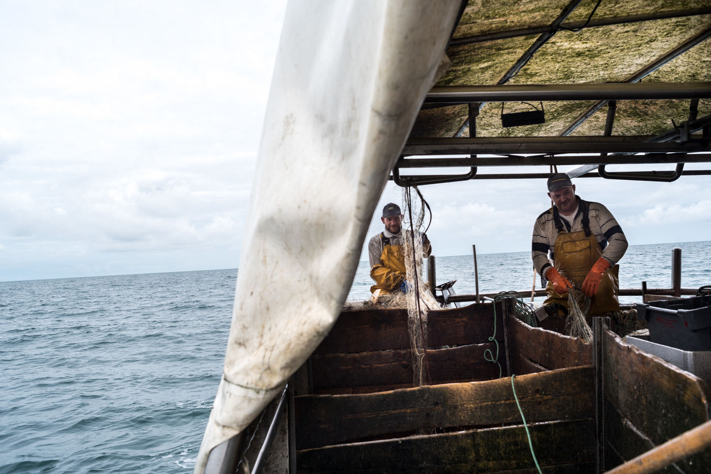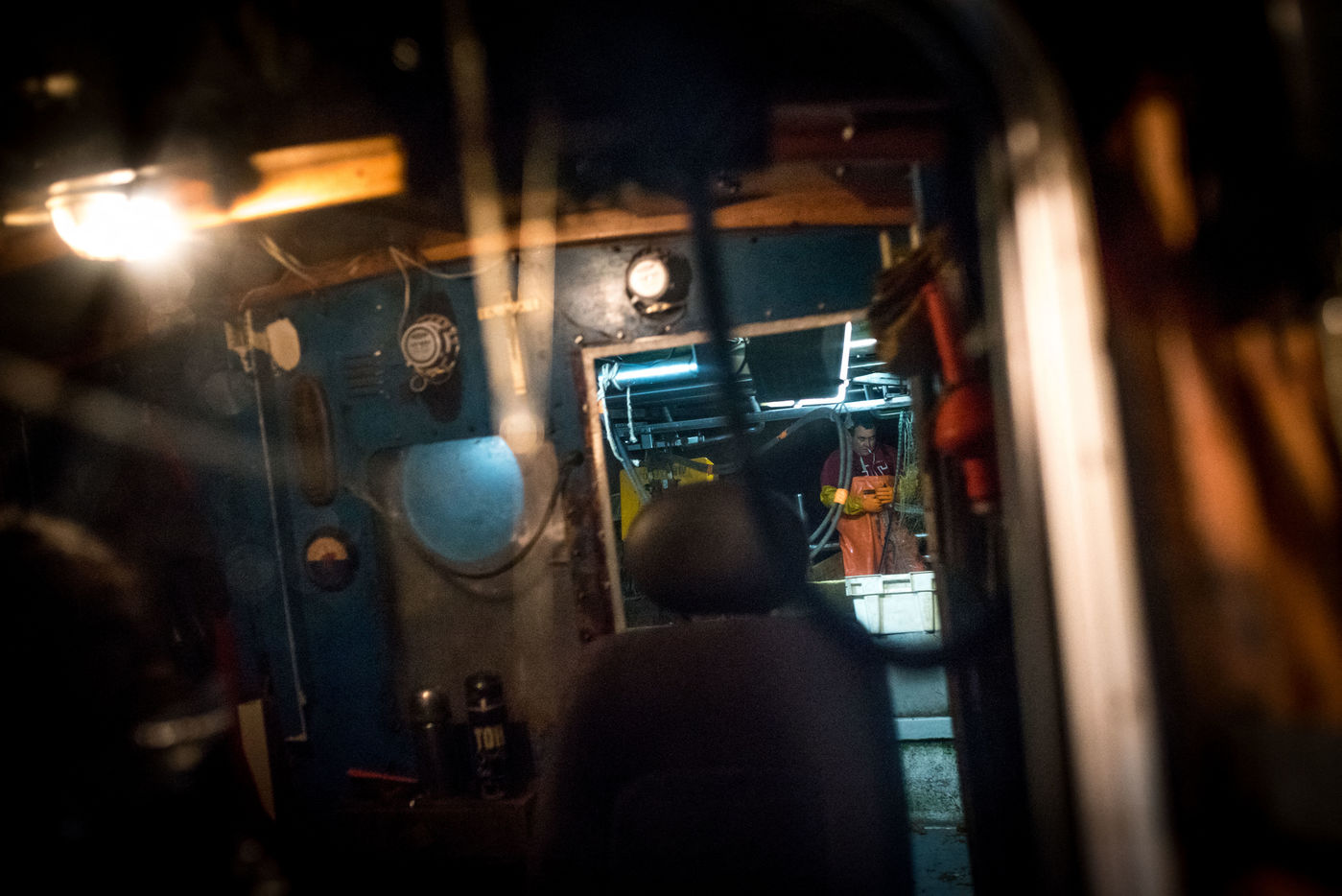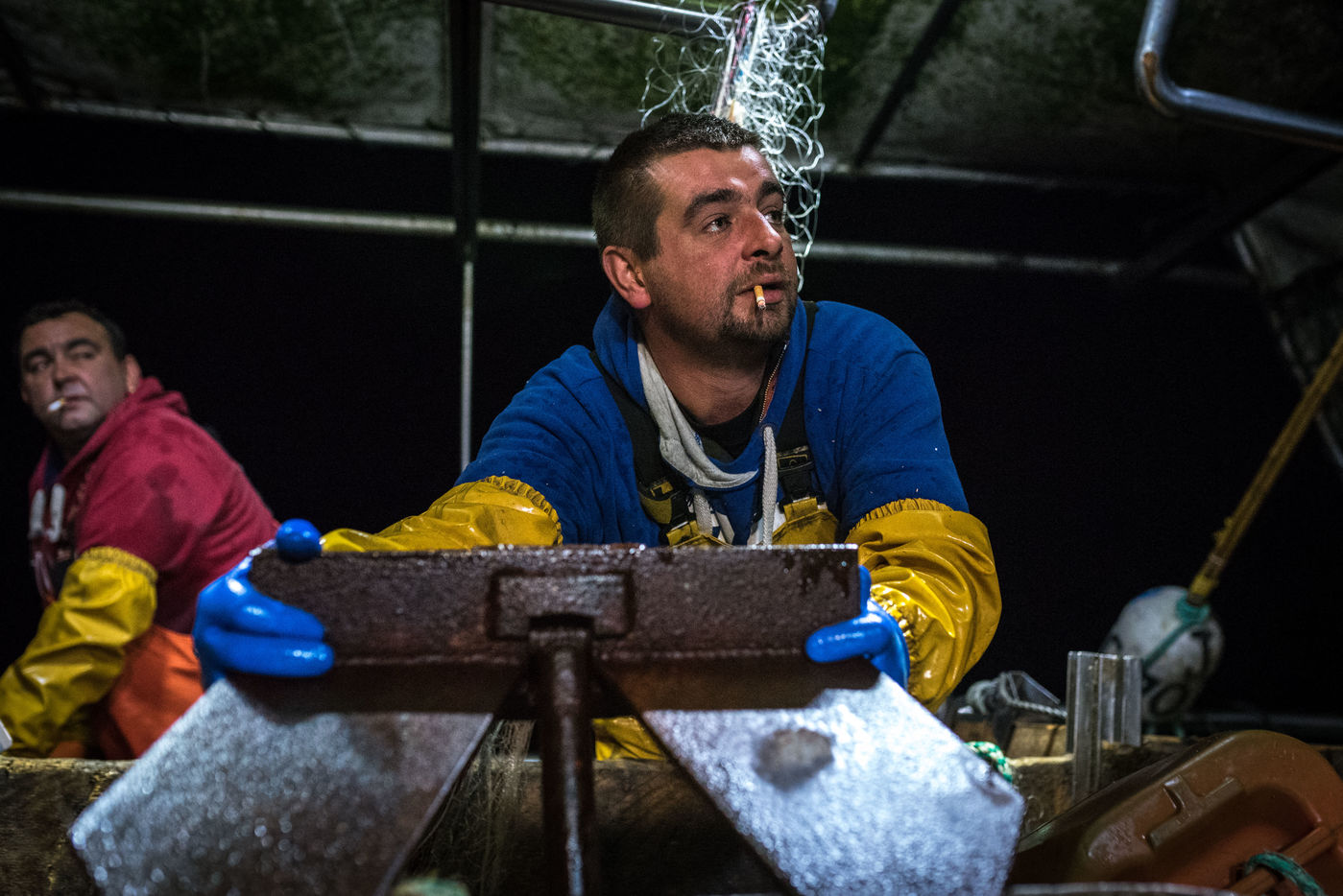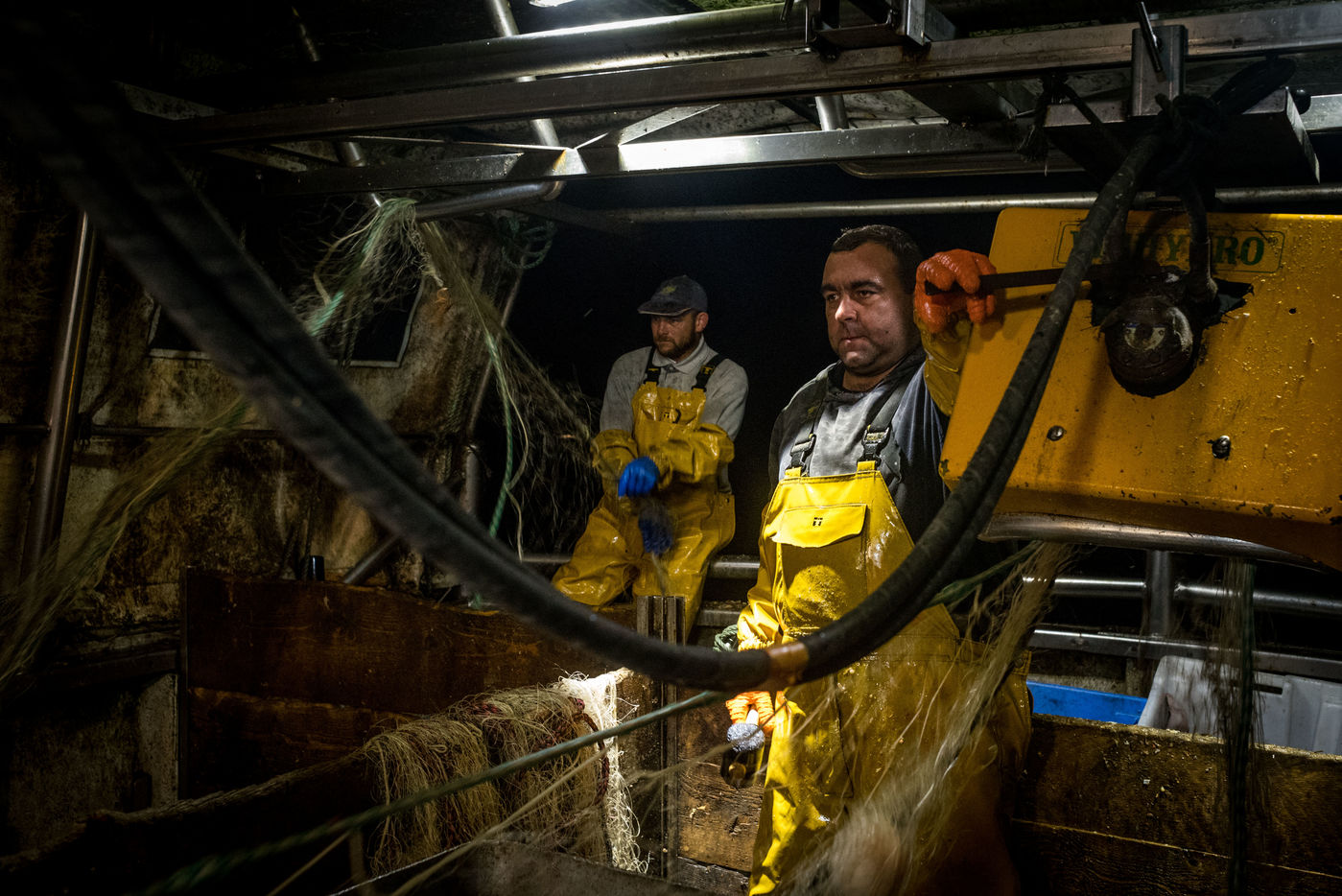 Jolie brise pratique un art dormant : 20 filets droits de 600 mètres sont posés, 24h plus tôt par 29 mètres de fond. Dans la nuit, au milieu des casiers en bois, sous les lumières crues, l'équipage guette la première relève de filet.