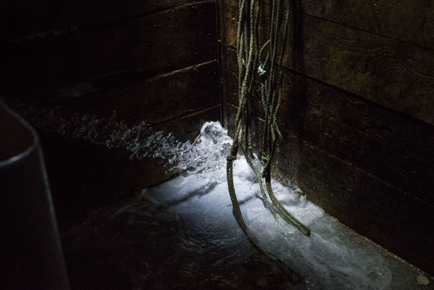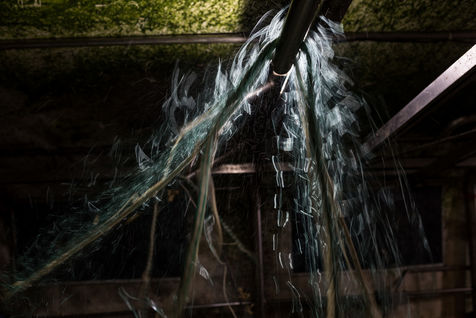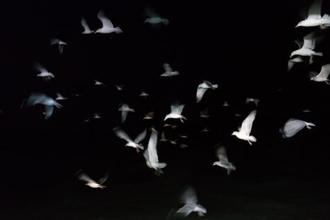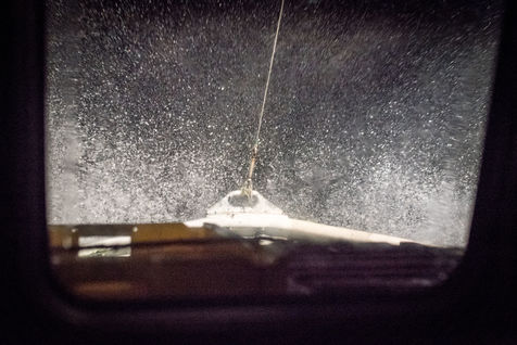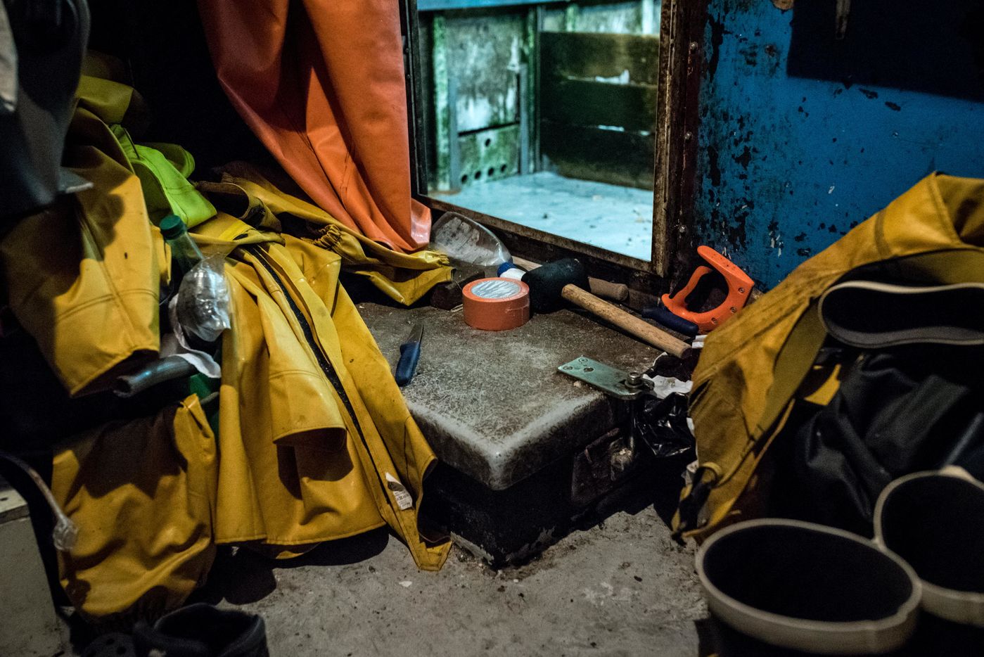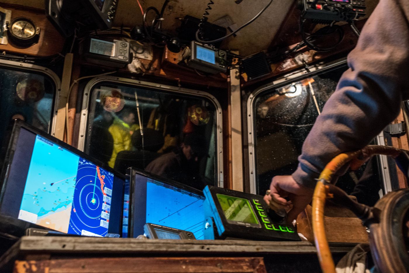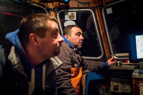 Jolie brise pratique un art dormant : 20 filets droits de 600 mètres sont posés, 24h plus tôt par 29 mètres de fond. Dans la nuit, au milieu des casiers en bois, sous les lumières crues, l'équipage guette la première relève de filet.