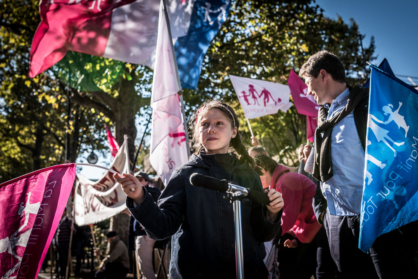 Deux ans après leur dernière grande manifestation, le collectif de " La manif pour tous " s'est réunit pour portester contre la loi Taubira le 16 octobre 2016. De nombreuses familles avec enfants ont fait le déplacement pour défiler jusqu'au Trocadéro.