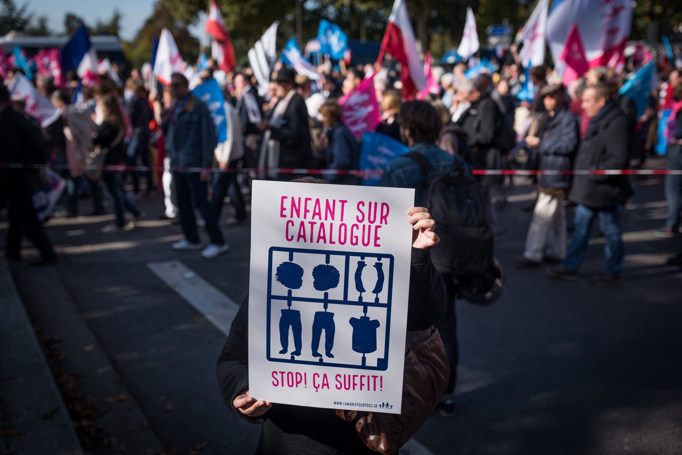 Two years after its last major demonstration, the collective 'La Manif pour tous' and thousands of supporters take to the streets to demand the repeal of the Taubira law on October 16, 2016 in Paris. Many families with children were in the crowd to walk to the Trocadero.