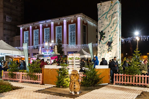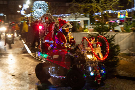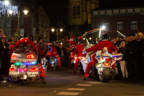 Parade of motorcyclists dressed as Santa Claus in the centre of Abbeville. Abbeville, France, December 21, 2019.