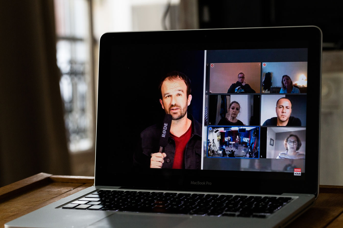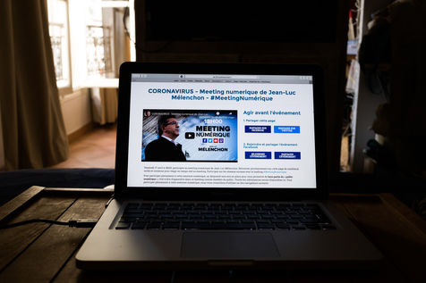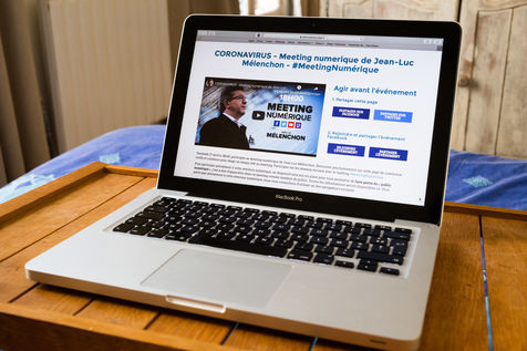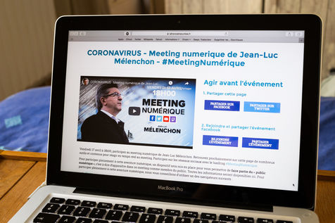Digital meeting of Jean-Luc Melenchon, deputy of France Insoumise, on the coronavirus health crisis, visible on a website and on social networks. Photo of a computer screen. Paris, France, Friday 17 April 2020.