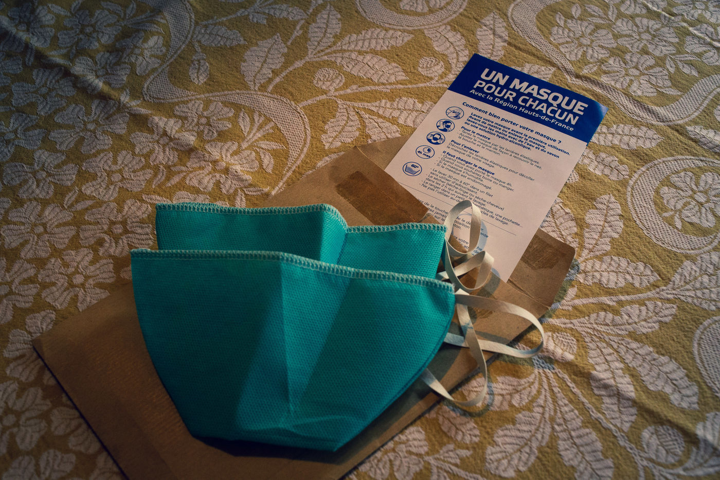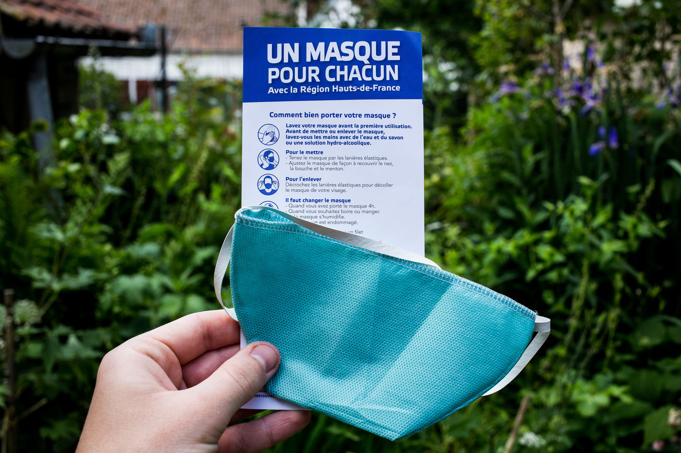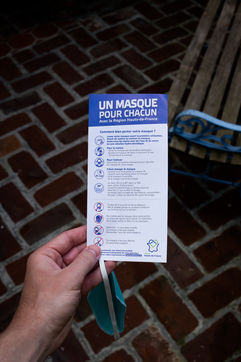 Masques distribués gratuitement par la region des Hauts-de-France dans la commune d'Epagnette, un masque par personne. Masque lavable et réutilisable une vingtaine de fois selon le mode d'emploi joint. Epagnette, France, Dimanche 24 Mai 2020.