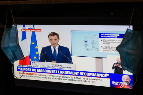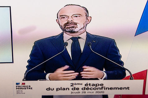 Presentation of the second step of deconfinement plan by prime minister Edouard Philippe broadcast on television. Screen photography. Paris, France, 28 May 2020.
