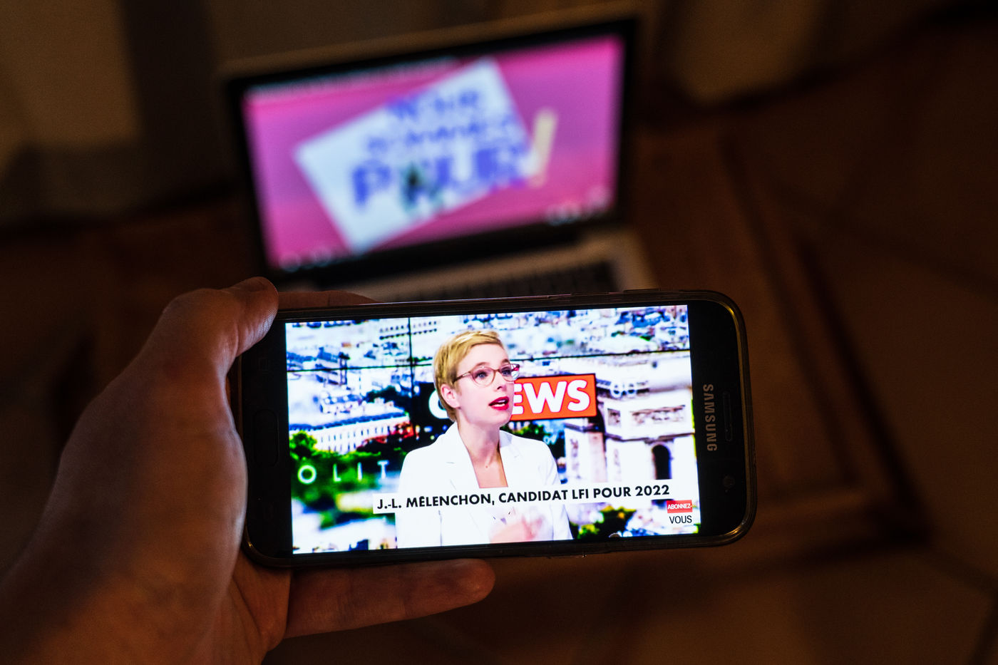 Digital meeting in augmented reality of Jean-Luc Melenchon, for the public liberties, deputy of France Insoumise, candidate for the presidential election of 2022. Photos of a computer screen. Paris, France, Saturday, November 28, 2020.
