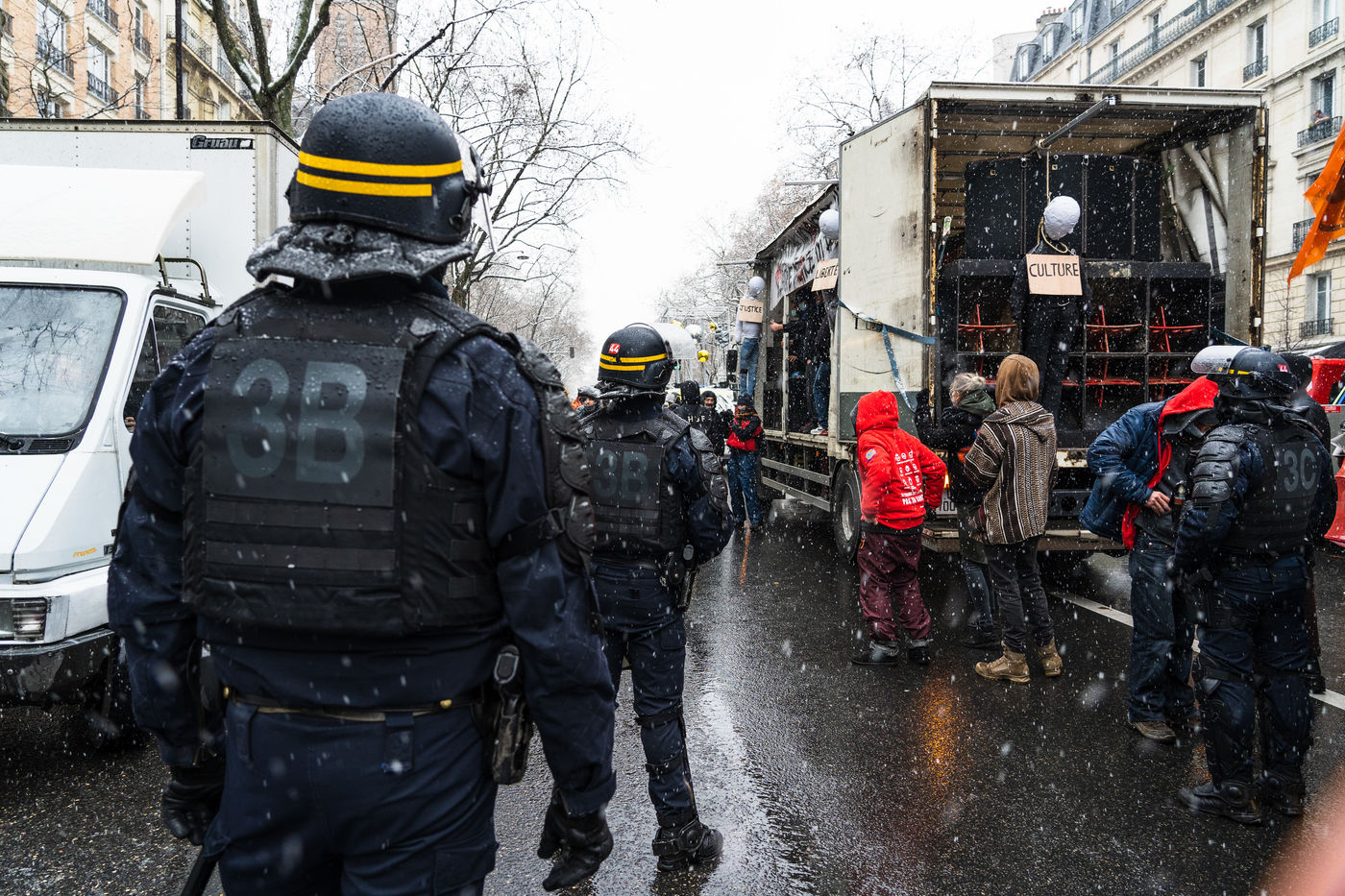 Culture 4 Liberty. Des collectifs festifs et organisateurs de soirées et des teufeurs ont rejoint la marche des libertés demandant la suppression de la Loi de Sécurité Globale jugée liberticide. Ils dénonçaient la répression subie par les participants et organisateurs de la free party qui s'est déroulée à Lieuron le soir du Nouvel An. Paris, France, Samedi 16 Janvier 2021.