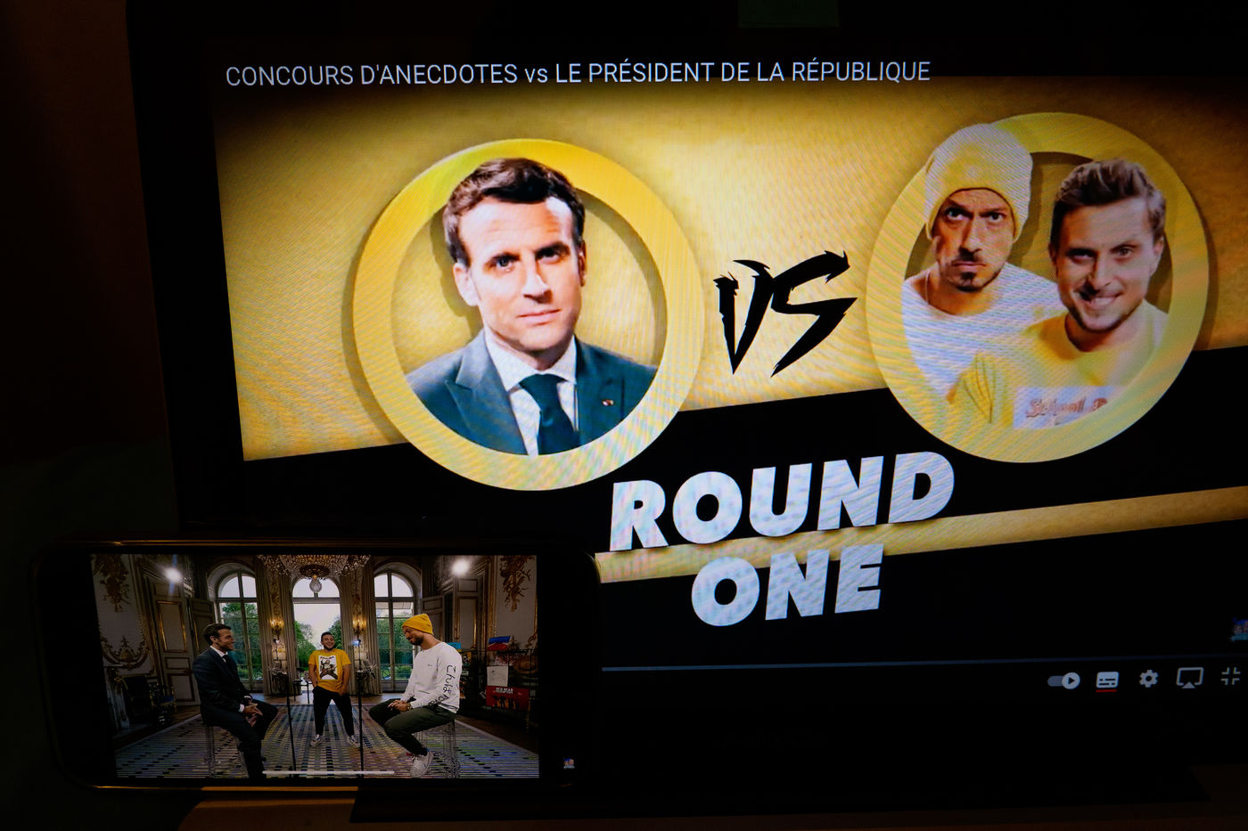 Emmanuel Macron avait promis d'inviter le duo de youtubeurs McFly et Carlito à l'Elysée si leur vidéo pour défendre les gestes barrières atteignait les 10 millions de vues, défi aisément relevé. La vidéo de la rencontre entre les youtubeurs et le chef de l'état sous la forme d'un concours d'anecdotes mise en ligne le 23 Mai 2021 a déjà récolté plus de 10 millions de vues. Photos d'un écran d'ordinateur et de smartphone dans un appartement parisien.