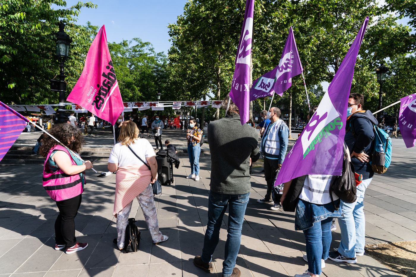 Demonstration at the Place de la Republique called by several collectives and trade unionists of health workers for the lifting of patents on vaccines to fight against the coronavirus epidemic.
