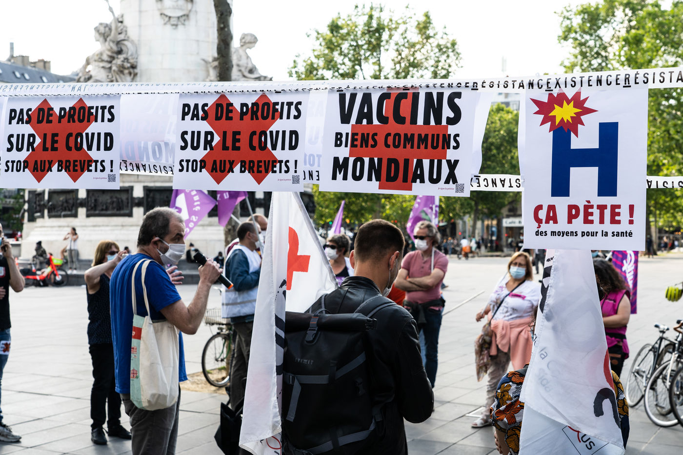 Manifestation place de la Republique à l'appel de plusieurs collectifs et syndicalistes des personnels de santé pour la levée des brevets sur les vaccins qui permettent de lutter contre l'épidémie de coronavirus.