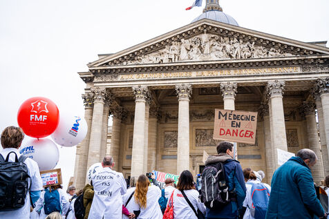 Day of strike and national demonstration in Paris of liberal doctors starting from the Place du Panthéon. Demonstration organized by the collective "Doctors for Tomorrow", supported by several unions (FMF, UFML, SML and Jeunes Médecins). The central demand of the collective is the doubling of the basic consultation fee c (from 25 to 50 euros), slogan the C=50 seen on many signs and banners. Thursday 05 January 2023.