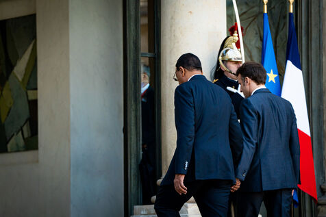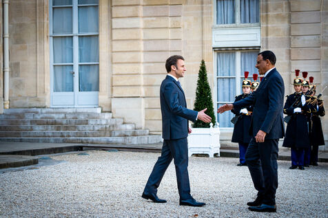 Reception in the main courtyard of the Elysee Palace. Meeting of the President of the French Republic Emmanuel Macron with the President of the Republic of Niger Mohamed BAZOUM. Working lunch to discuss the Franco-Nigerian partnership in the fight against terrorism in the Sahel, developments in the security situation in the region, and bilateral cooperation between the two countries. Thursday, February 16, 2023.