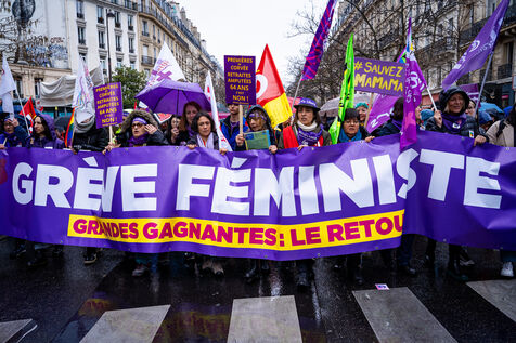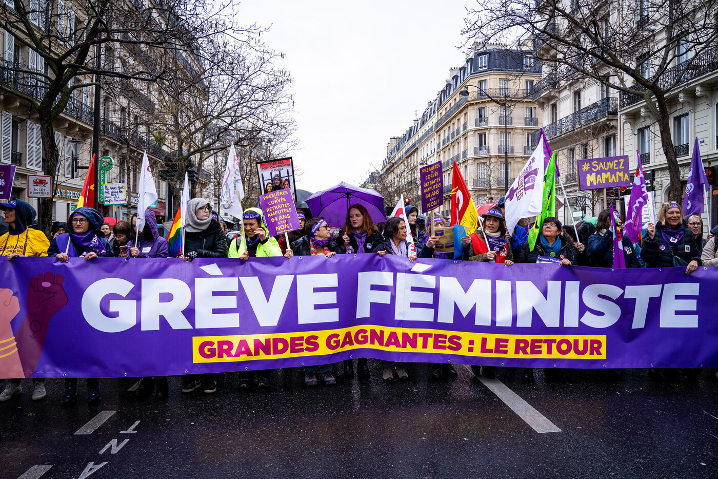 Manifestation féministe du 8 mars 2023 à Paris pour la journée internationale de lutte pour les droits des femmes. Contre le projet de réforme des retraites du gouvernement dont les femmes sont parmi les premières victimes. Mercredi 8 mars 2023.