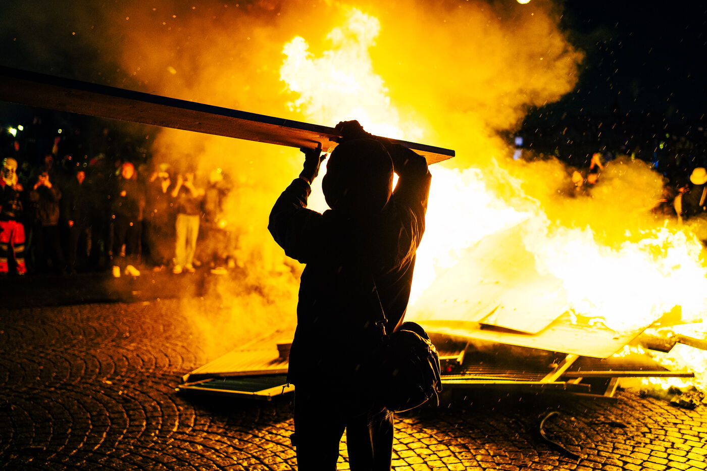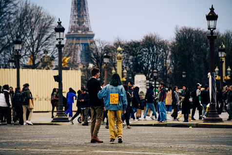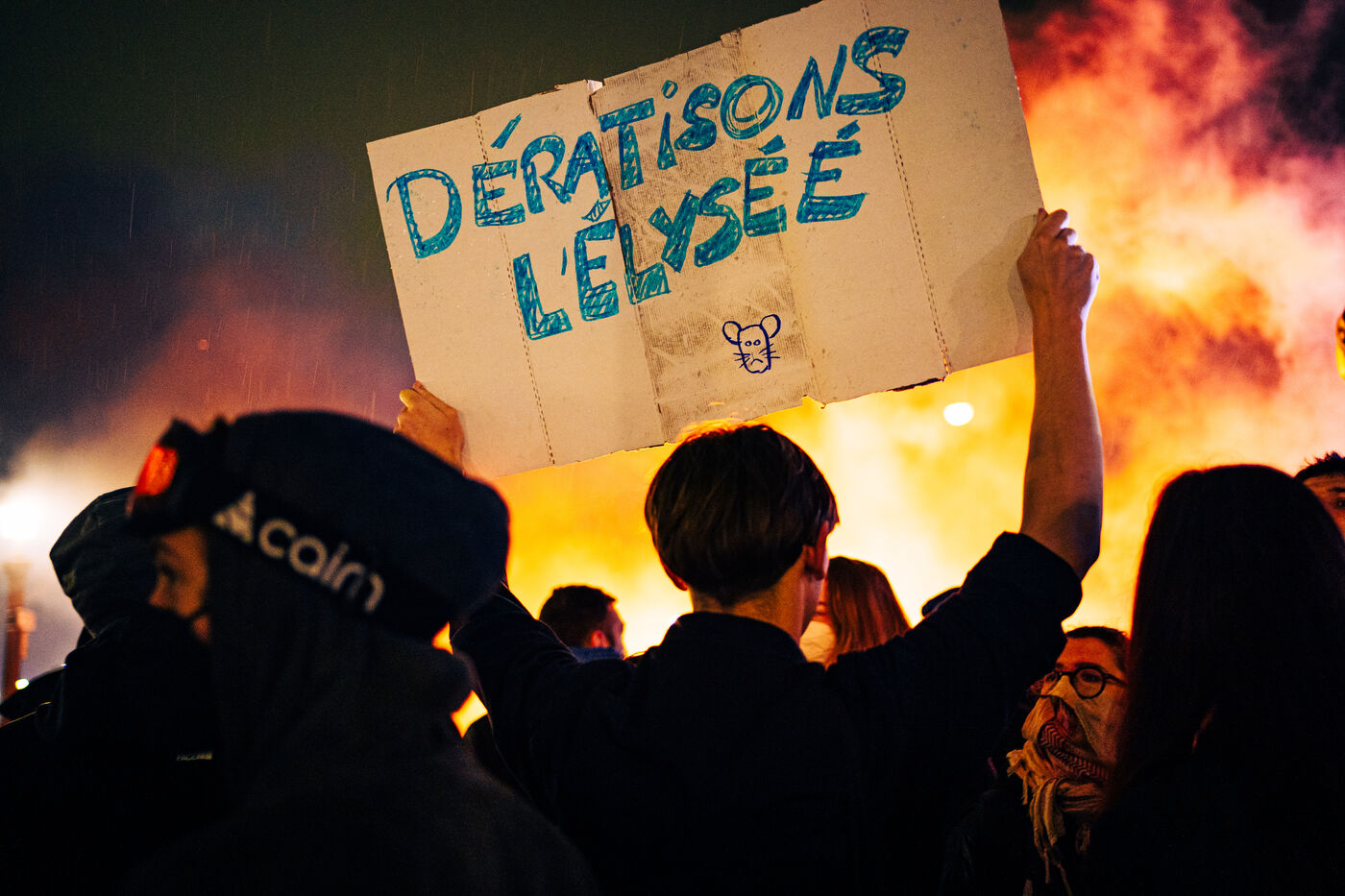 Manifestation Place de la Concorde contre le projet de réforme des retraites dans le cadre du PLFRSS 2023 (Projet de loi de financement rectificatif de la sécurité sociale), et contre l'utilisation à l'assemblée nationale de l'article 49 alinéa 3 (49.3) par le gouvernement français et sa première ministre pour un passage en force de la réforme, processus jugé anti démocratique par les nombreux manifestants rassemblés, beaucoup de jeunes. Vendredi 17 mars 2023.