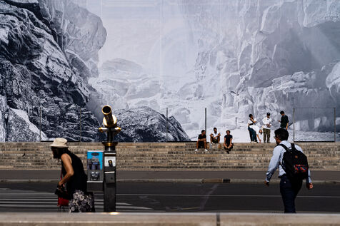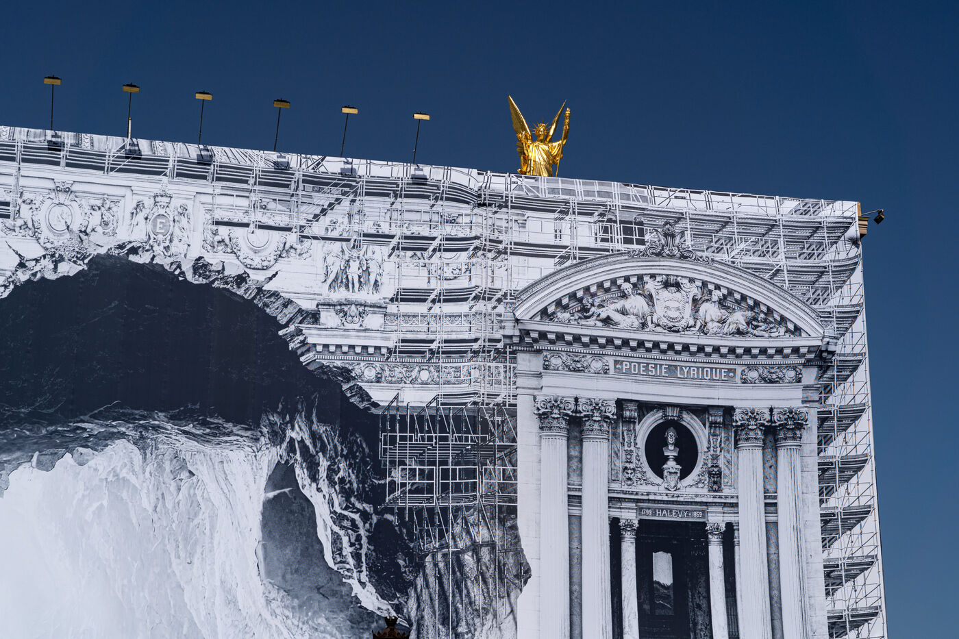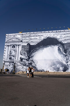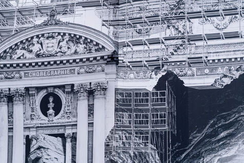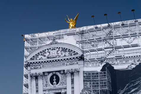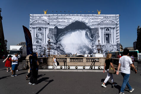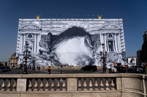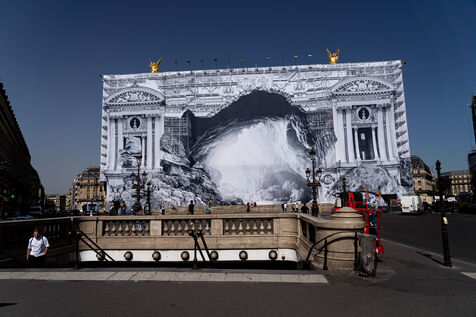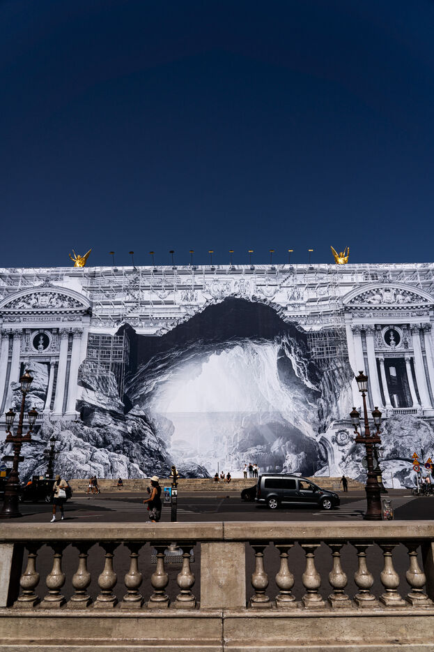 RETURN TO THE CAVE - Act I - The entrance to the cave. As part of the restoration of the Palais Garnier, street artist JR (Jean René, contemporary artist) was invited by the Opéra national de Paris to dress the scaffolding covering the monument. From September 6 to 25, 2023, the façade of the Opéra, the temple of music and dance, will be transformed to reveal the entrance to an immense cavern opening onto a perspective of rock and light. Alluding to the romantic codes of the 19th century, but also to grand opera stage sets, the Napoleon III architectural elements seem caught in a double movement of time, ruin. A work in progress, as evidenced by the numerous scaffoldings present, a nod to the real and necessary work that physically supports this installation.