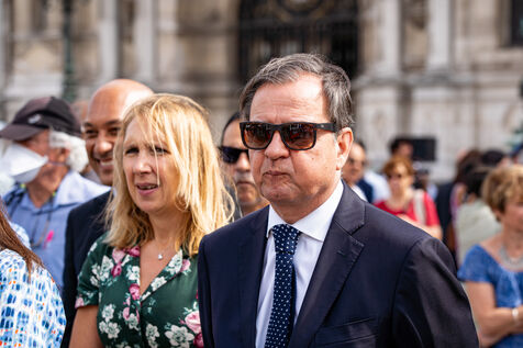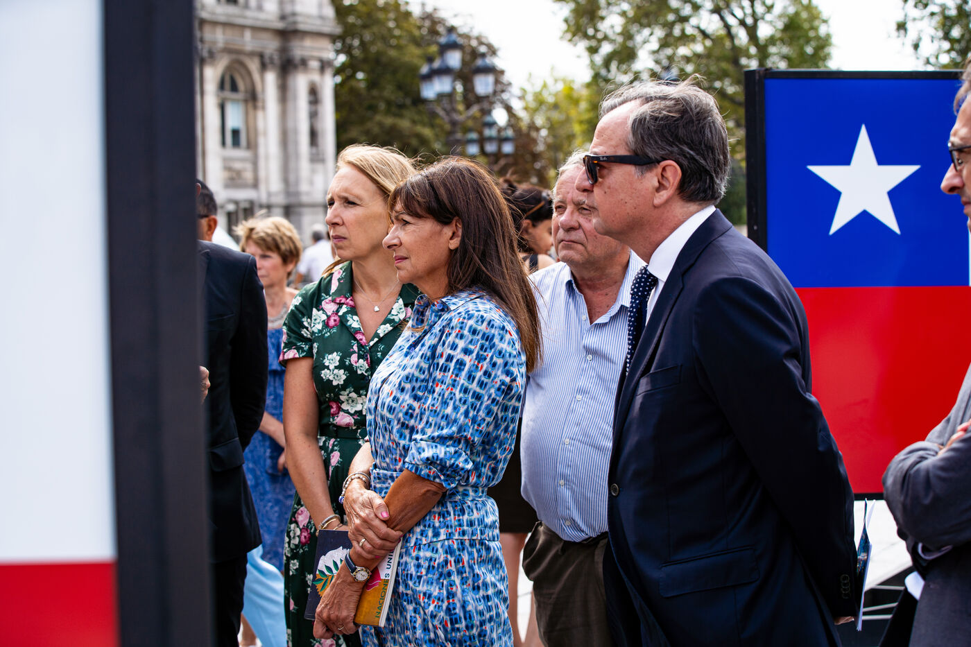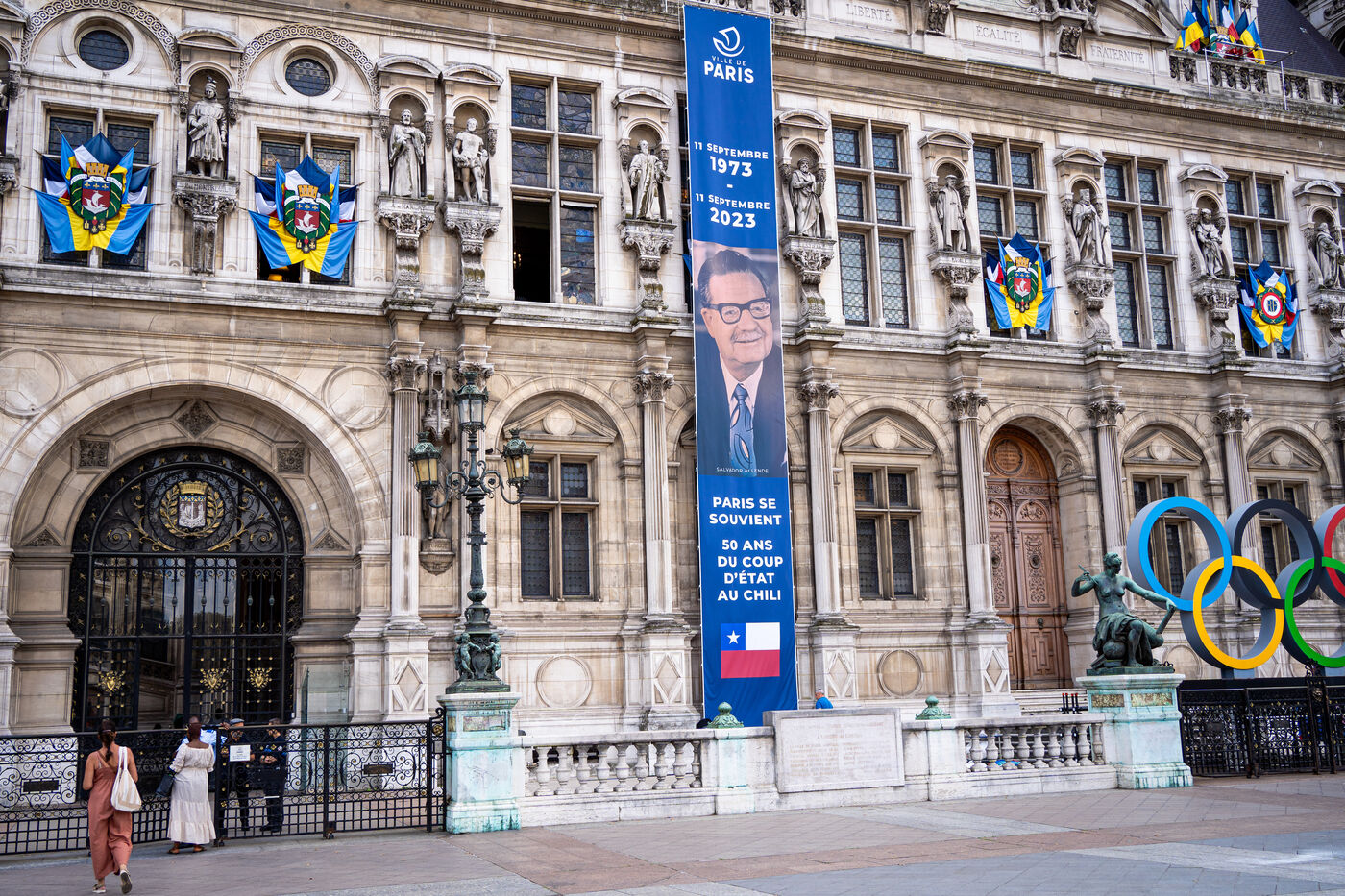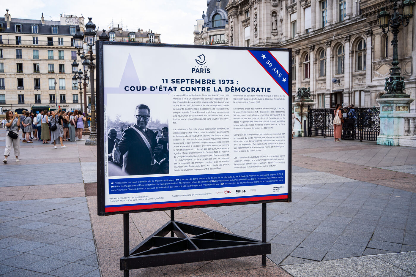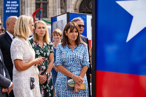 Commémoration du 50ème anniversaire du coup d'État au Chili. En souvenir des victimes et afin de saluer la mémoire des opposants au régime dictatorial, la Ville de Paris organise plusieurs évènements sur son territoire jusqu?en novembre 2023. Inauguration par Anne Hidalgo, Maire de Paris, de l?exposition photo 11 septembre 1973 : coup d?État contre la démocratie sur le parvis de l?Hôtel de Ville. Place de l'Hôtel de Ville, Paris, lundi 11 septembre 2023.